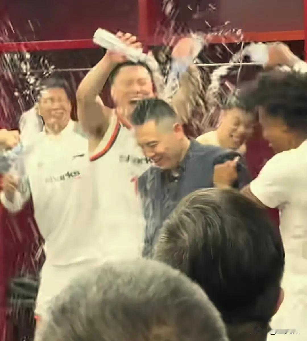 在提前四轮锁定常规赛冠军之后,上海队的更衣室彻底疯狂,所有队员都把手里的水洒到了