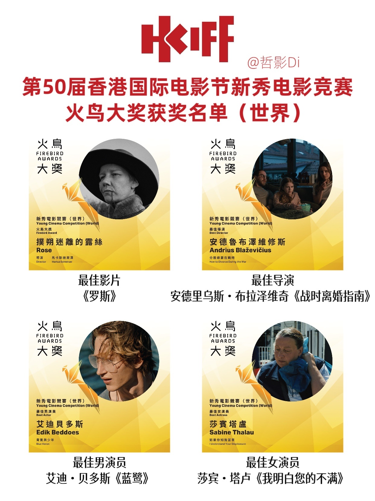 第五十届香港国际电影节公布新秀电影竞赛火鸟大奖获奖名单,桑德拉·惠勒获得第76届柏林电影节最佳主角奖的影片《罗斯》摘得世界电影最佳影片;华语电影最佳影片则颁给了岗珍执导的影片《一个夜晚与三个夏天》。获奖名单见图1-图2。
