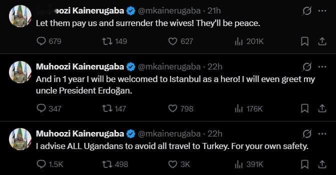 乌干达总统之子要求土耳其赔偿10亿美元,并将最美女子许配给他为妻。昨日,乌干达总统约韦里·穆塞韦尼之子、该国陆军总司令穆胡齐·卡伊内鲁加比在网上发表了一系列反土耳其言论。他声称土耳其在与乌干达的战争中"没有获胜的机会",因为"耶稣基督和穆罕默德·阿里"都会站在乌干达一边。他还要求安卡拉赔偿10亿美元,并将土耳其最美女子许配给他为妻。
