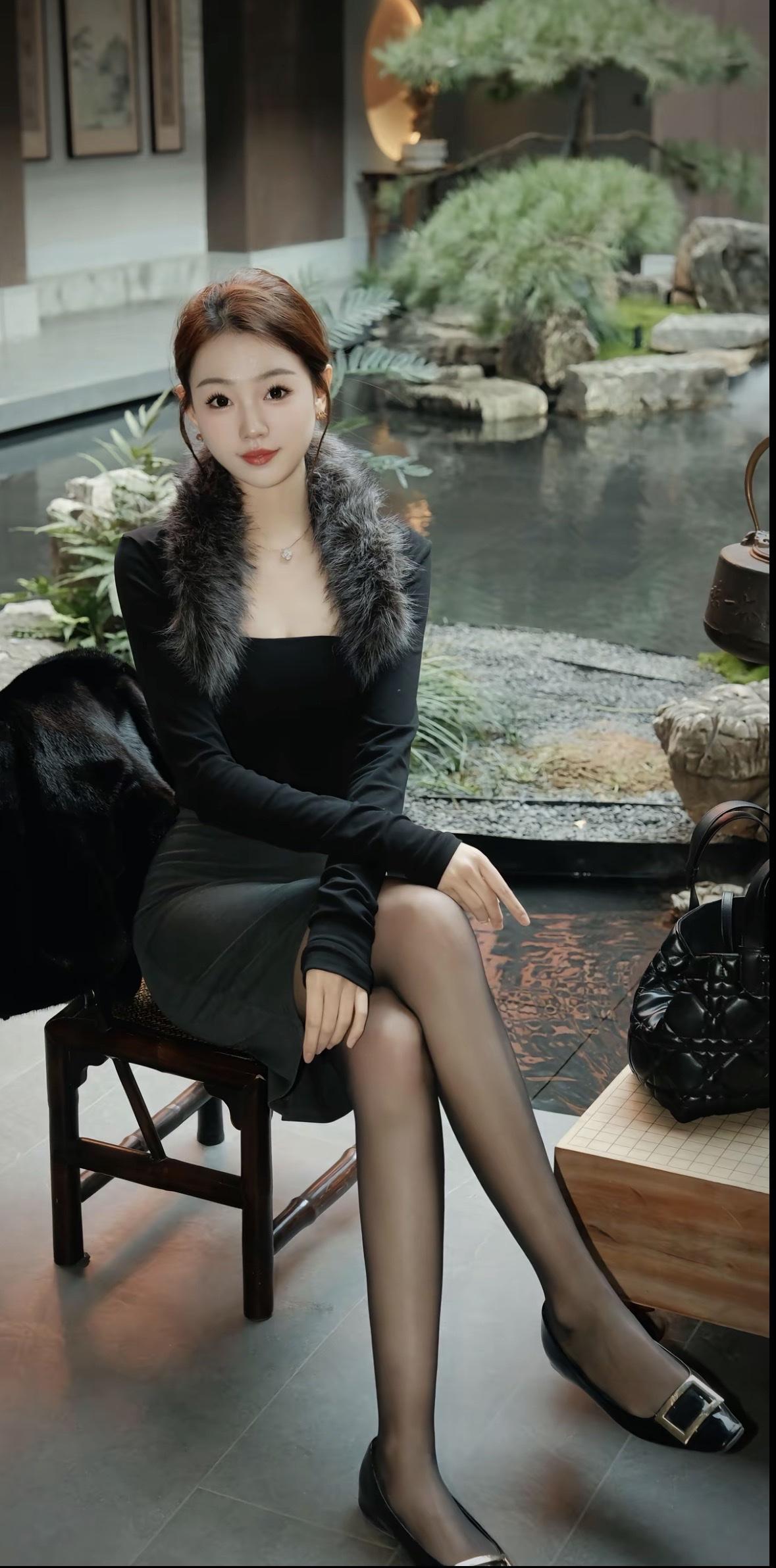 优雅黑裙搭配毛绒外套,坐在静谧庭院中,感受自然与时尚的完美融合。