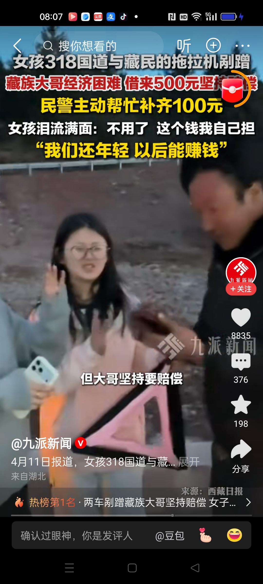 这一系列的事情表现出来藏民大哥虽然有困难,还是积极处理,借钱都承担。交警助人为乐,也是人民好警察。女孩更是大度宽容,让这个事情就像没有发生一样。