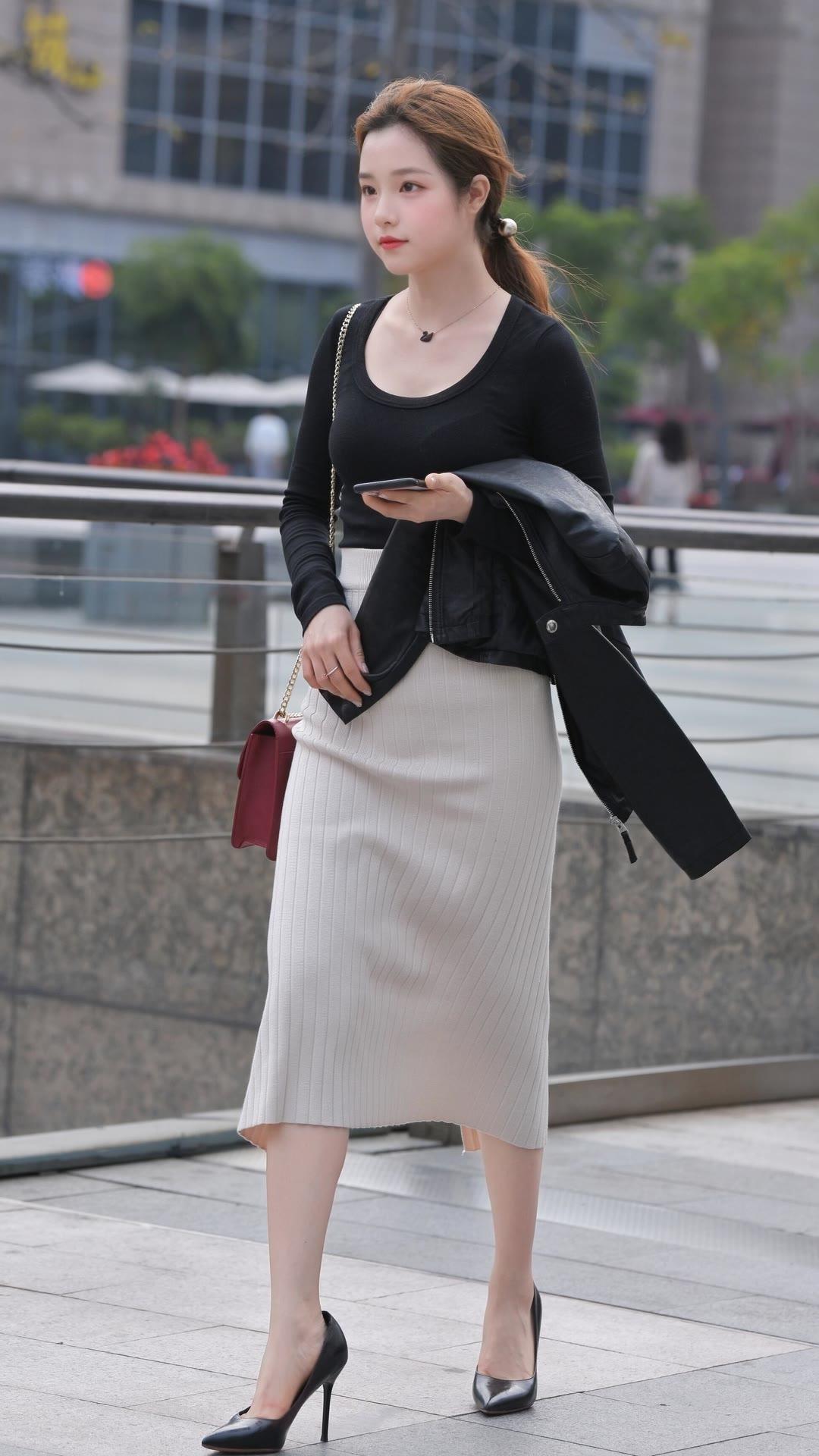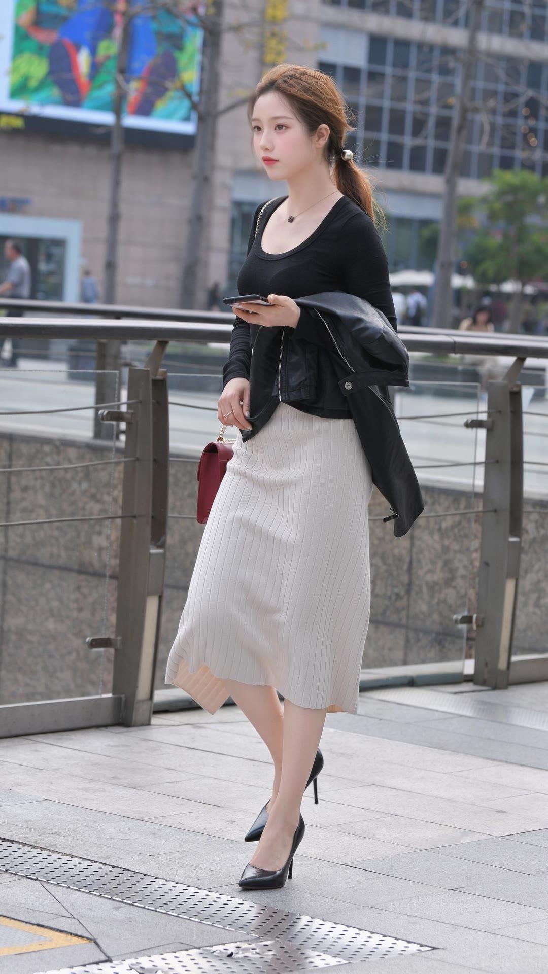 春日生活打卡季黑色U领针织衫+米白色条纹裙,脚踩一双黑高跟鞋,既得体又很有女人味