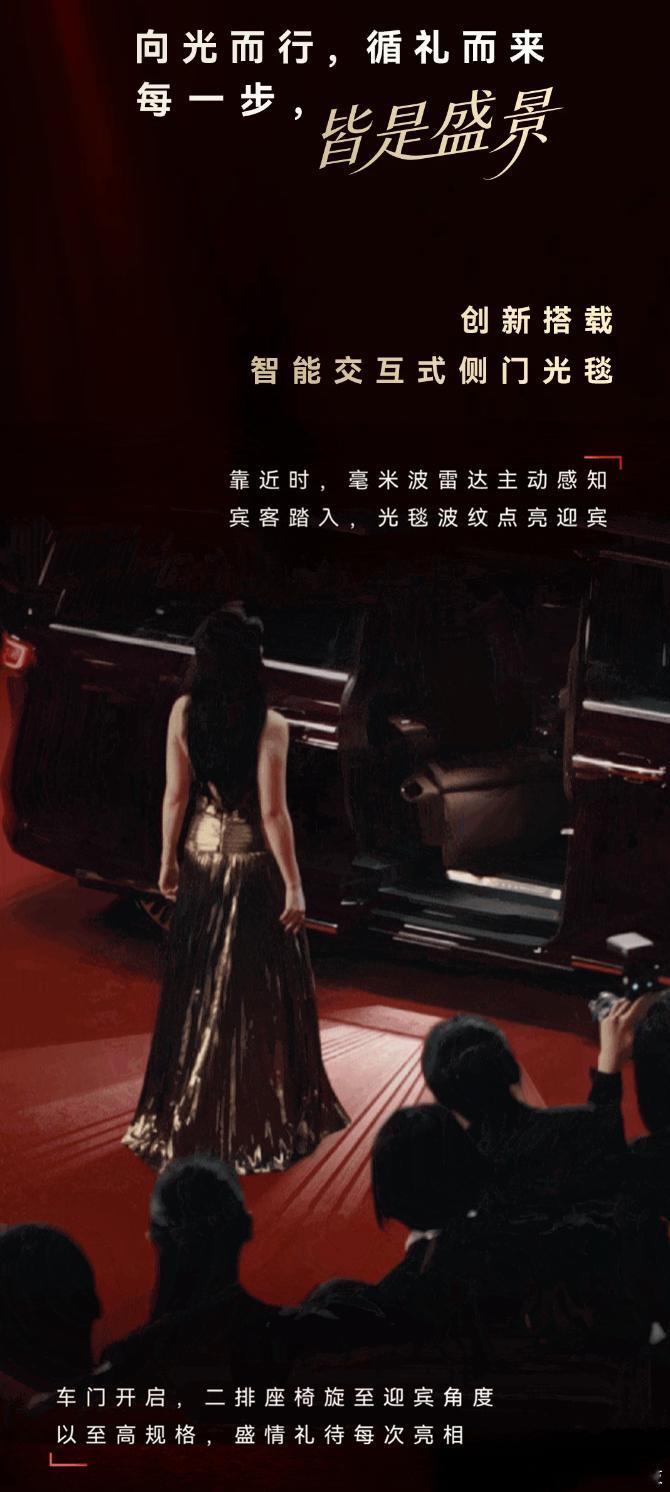 不愧是MPV科技车皇,智界V9的排面直接拉满!智界V9首发智能交互式侧门光毯打破行业常规,告别繁琐操作,上车过程优雅从容,改善传统MPV上下车不便、缺乏质感的痛点。搭配智界V9可自定义灯语,以及“跃动流阶”“星河开路”专属灯效,还有家族经典动态灯语加持,脚下是璀璨光毯,眼前是灵动光影,无论日常通勤、商务出行还是家庭出游,都能收获满满的幸福感与尊崇感,尽显高端MPV的格调与情怀。