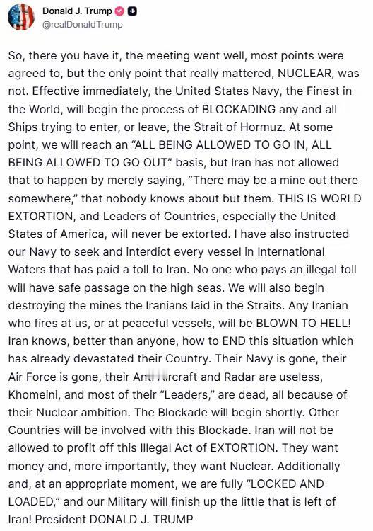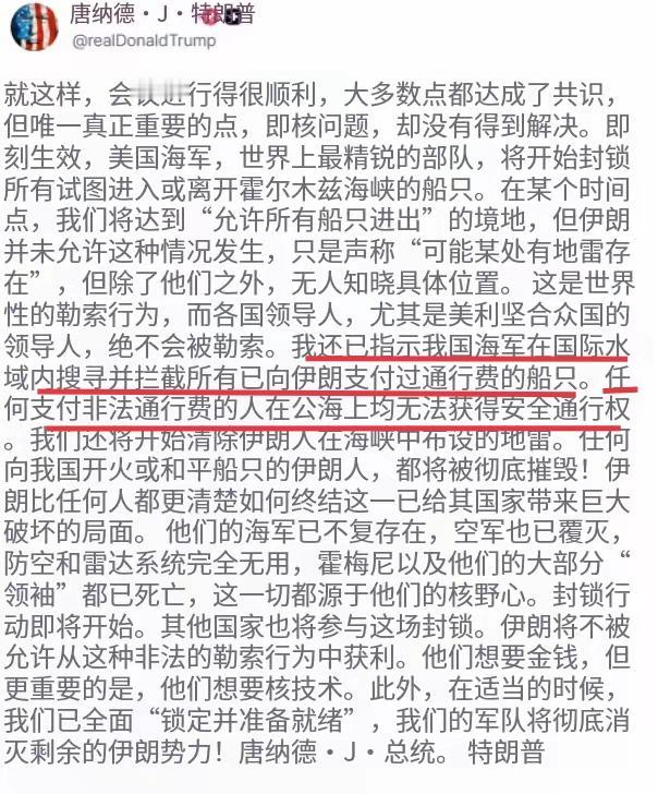 特朗普总统命令美国海军封锁所有进出霍尔木兹海峡的船只“立即生效”。