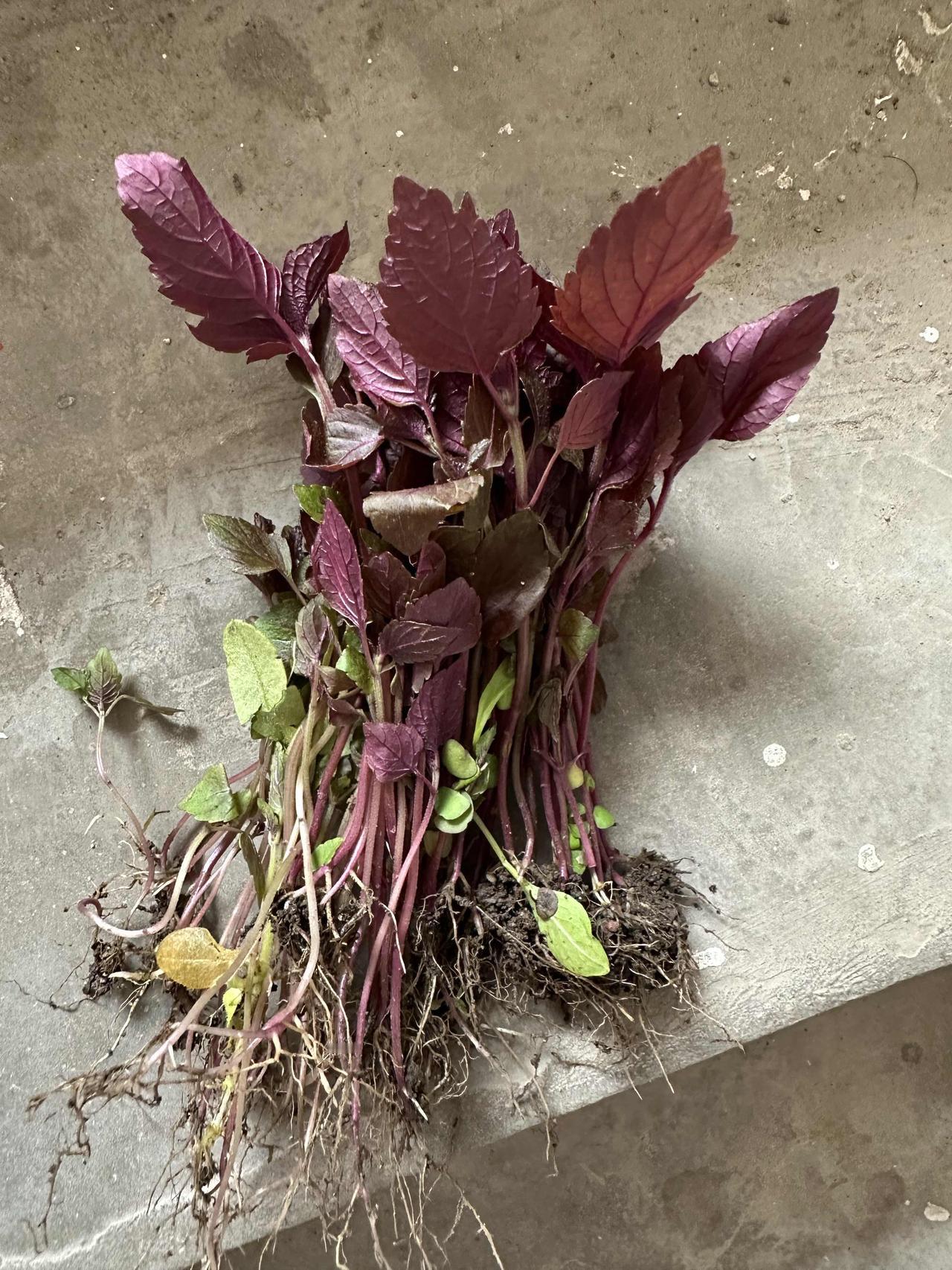 路边泥地长出了好多紫苏苗,我徒手拔了一小把拿回家种在窗台的花盆里。