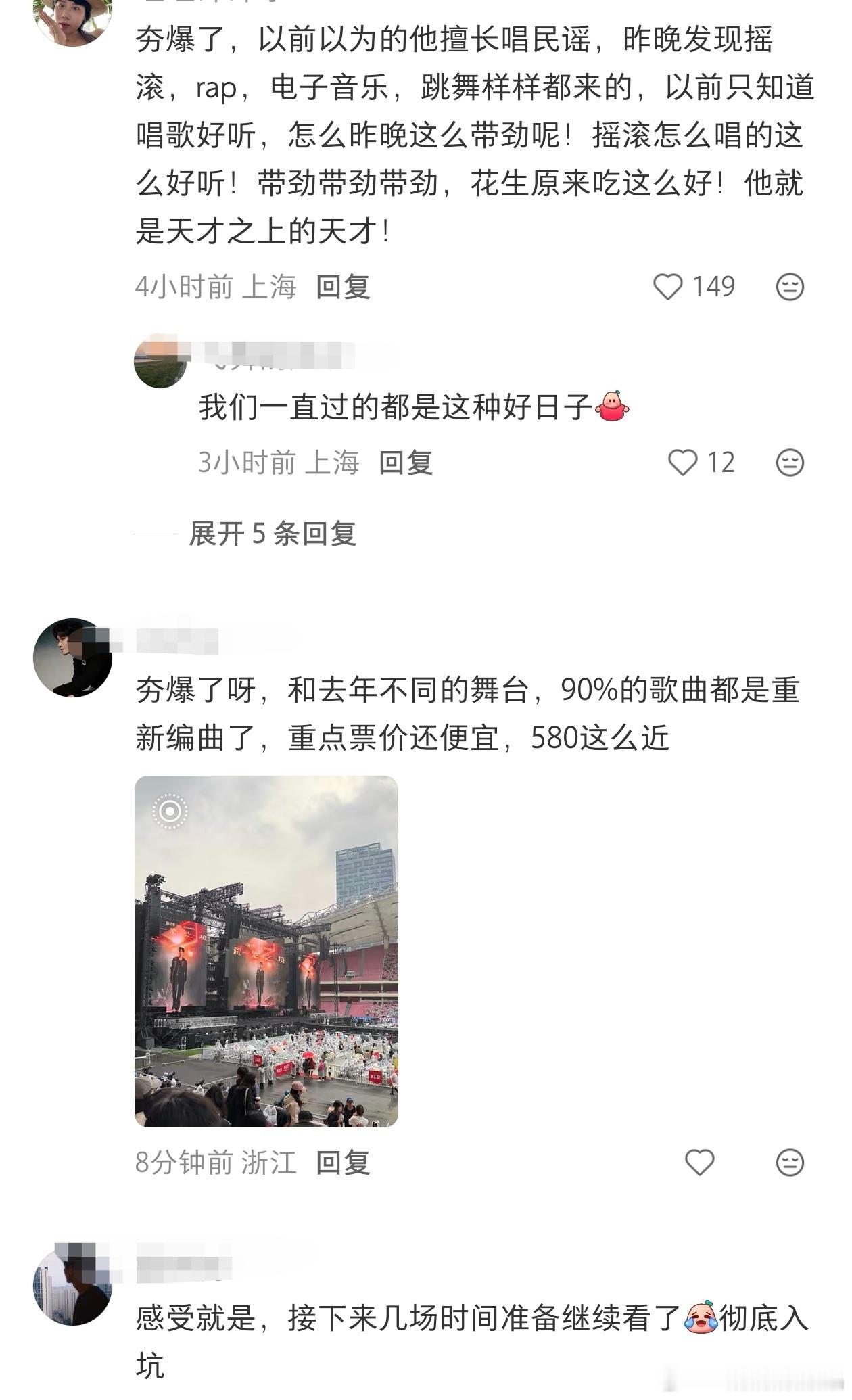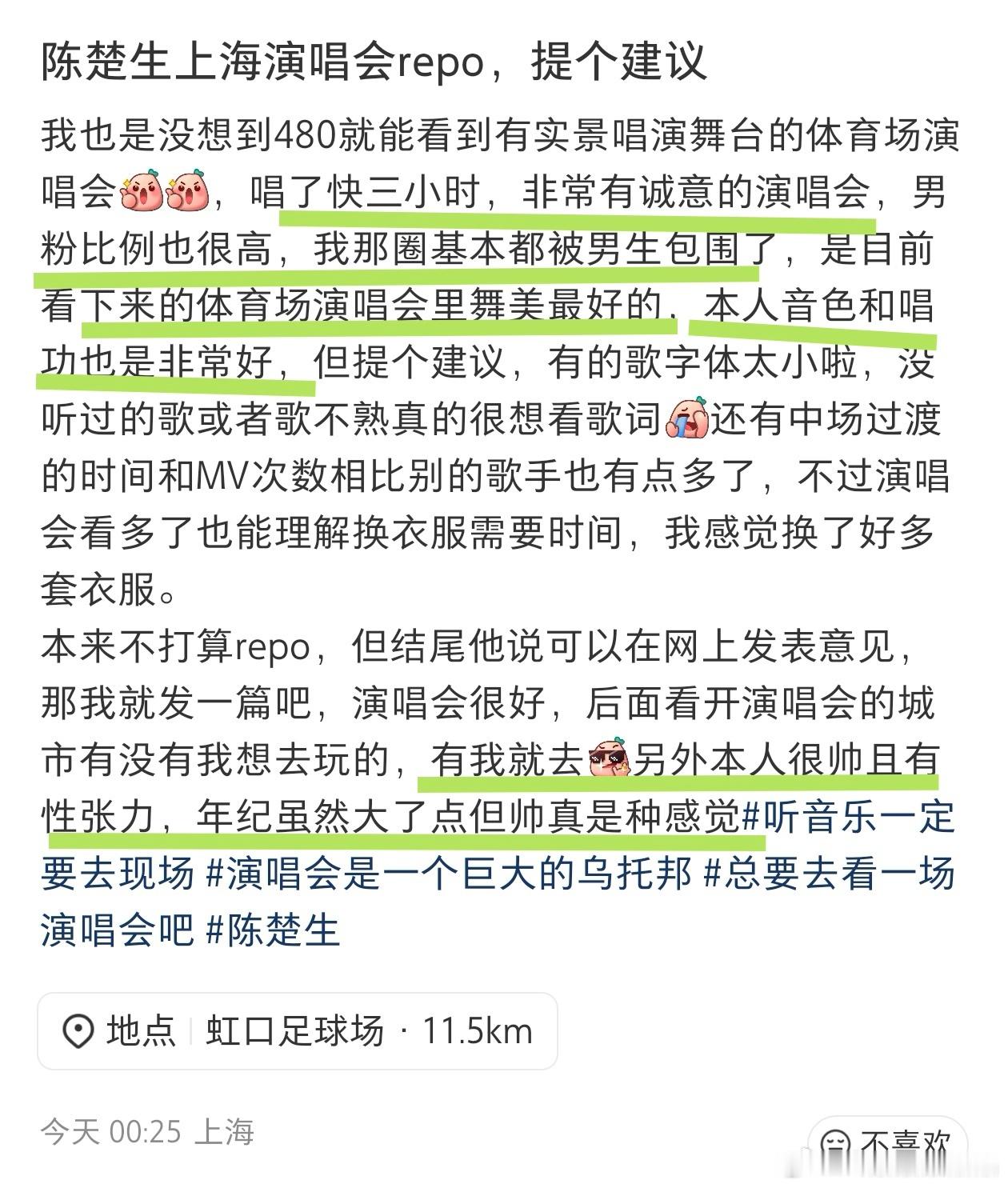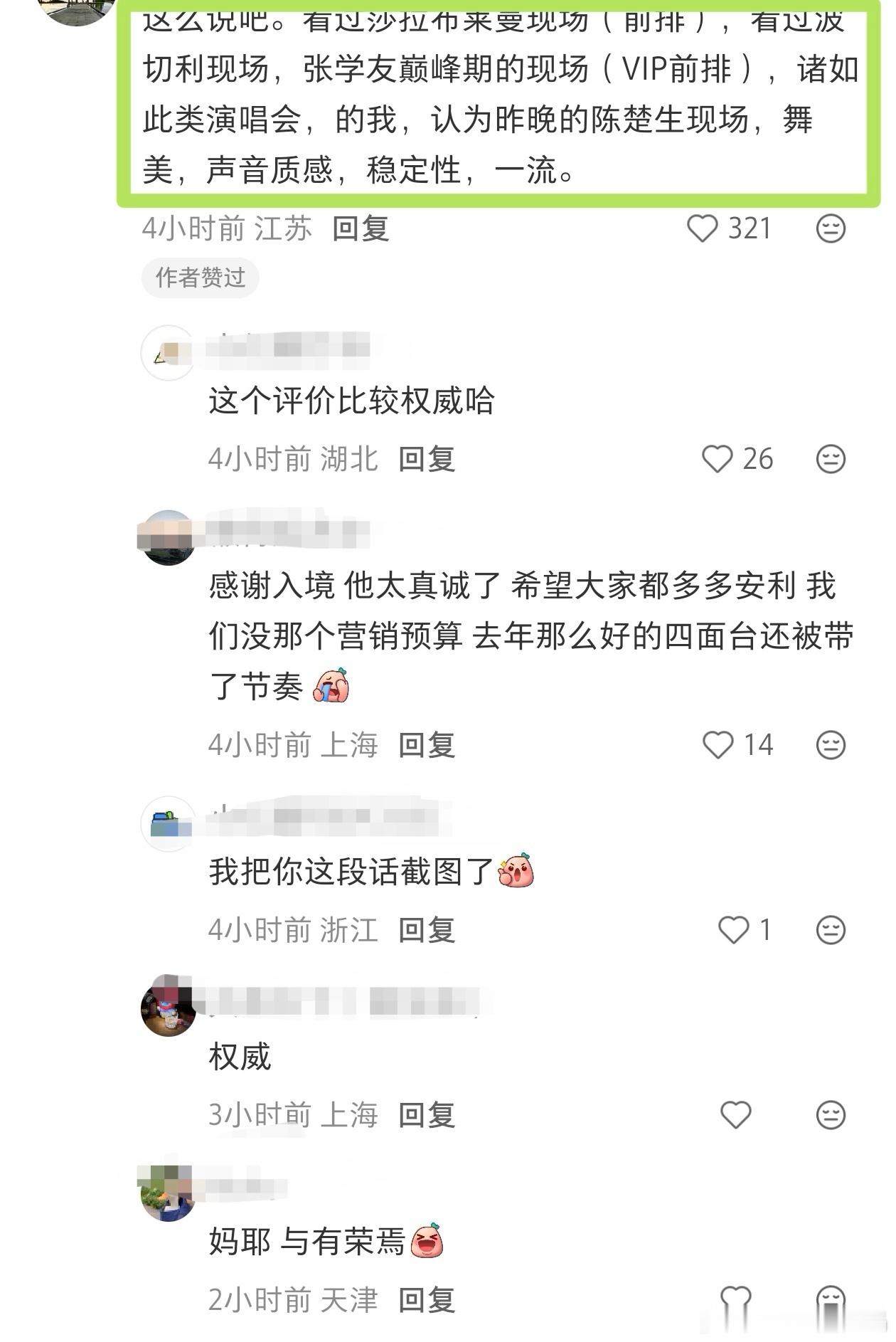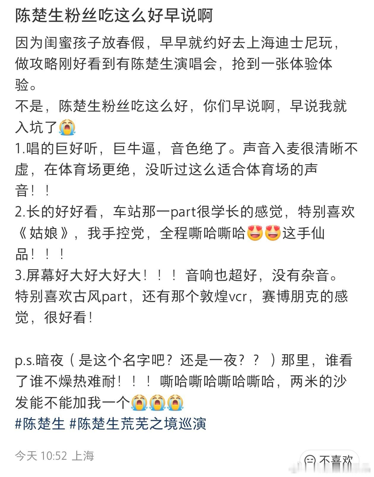 昨天陈楚生在开完两场荒芜之境演唱会上海站后,立马开直播和歌迷沟通,还让大家多多在网上提建议,他们会看,我帮他搜集了一些真路人的反馈。