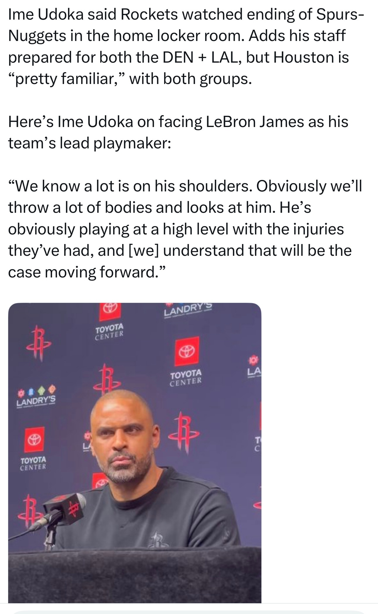 在谈到对阵詹姆斯时,乌度卡说:“我们很清楚,湖人的重担都压在他的肩上。显然,我们会用多人轮换、多种防守策略去针对他。在球队饱受伤病困扰的情况下,他依然打出了极高的竞技水平,我们也清楚,这种情况在接下来的系列赛中会持续存在。”