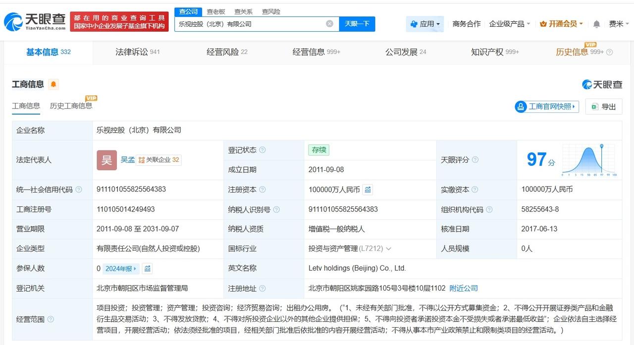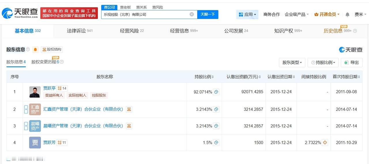 乐视控股(北京)有限公司成立于2011年9月,法定代表人为吴孟,注册资本10亿人民币,经营范围包括项目投资、投资管理、资产管理等,由贾跃亭、汇鑫资产管理(天津)合伙企业(有限合伙)、晨曦资产管理(天津)合伙企业(有限合伙)、贾跃芳共同持股,其中贾跃亭持股比例约为92%。