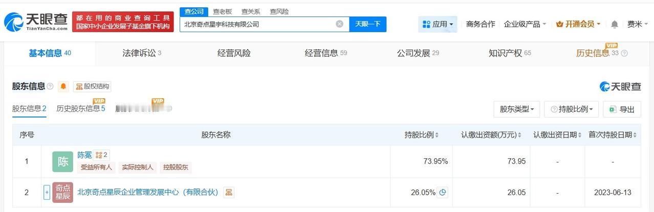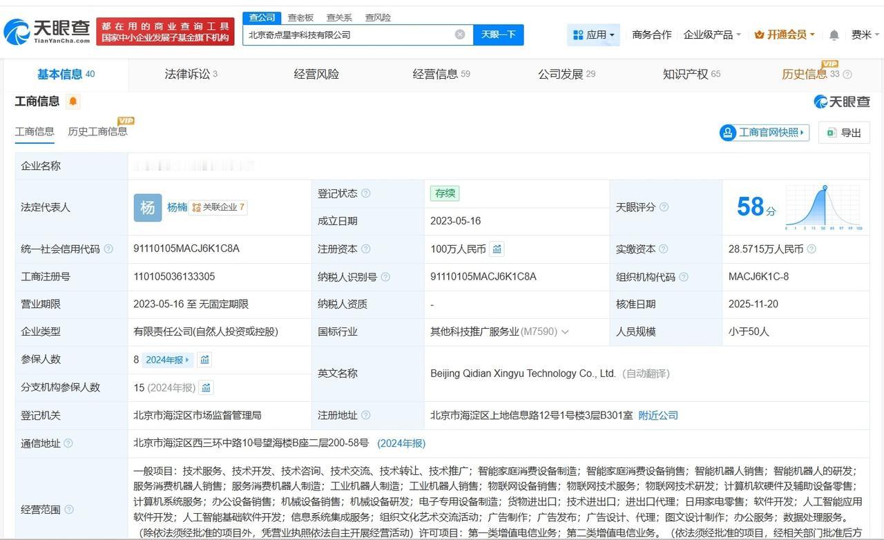 天眼查App显示,哩布哩布AI关联公司北京奇点星宇科技有限公司成立于2023年5月,经营范围包括服务消费机器人制造、工业机器人制造、工业机器人销售等,由陈冕、北京奇点星辰企业管理发展中心(有限合伙)共同持股。变更记录显示,去年11月,张子捷卸任该公司法定代表人、经理,陈冕卸任董事,杨楠接任法定代表人、董事、经理;去年5月,该公司注册资本由约129万人民币减至100万人民币。