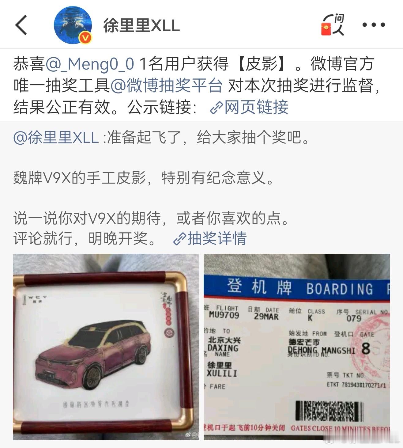 上个月抽奖,魏牌V9X的手工皮影。抽中了,一直忘了发货,也不提醒我一下...
