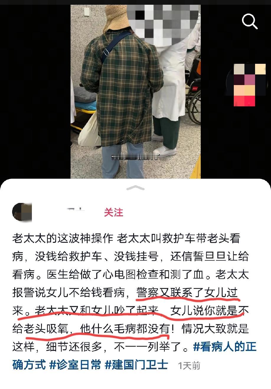 4月12日,北京某医院,老太太叫救护车带老头看病,没钱给救护车、没钱挂号。医生说