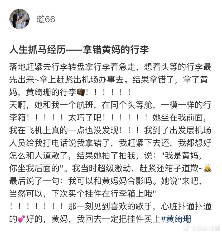 网友拿错黄绮珊的行李黄绮珊的行李被路人错拿了 有网友分享自己下飞机后拿行李,不小心把黄绮珊(黄妈)的行李箱给拎走了最神奇的是,两人不仅同航班同舱、座位一前一后,连行李箱都长得一模一样~等网友跑回去疯狂脑补该怎么道歉时,黄妈不仅一点没生气,还笑眯眯地拍拍网友说:“我是黄妈,你坐我后面的~” 甚至大方合影,这个黄绮珊真的太好了
