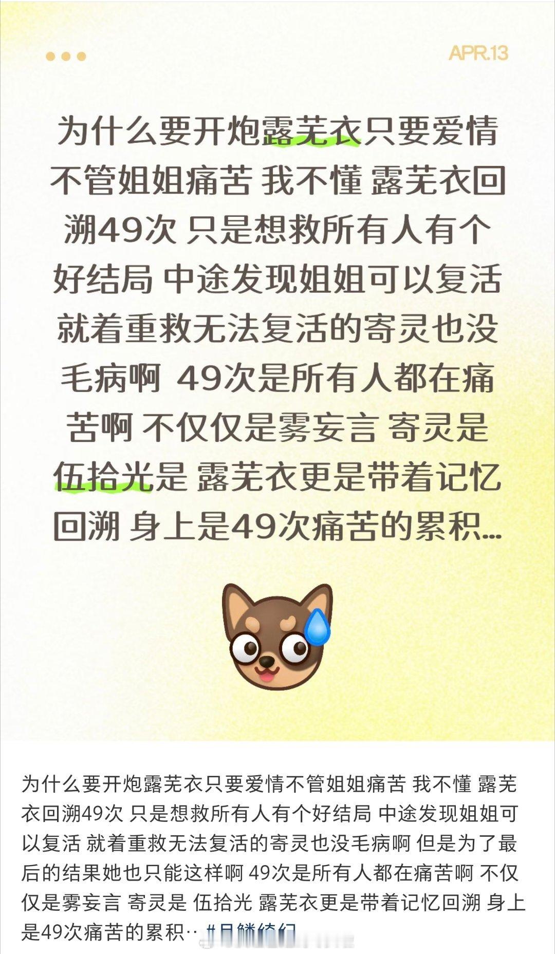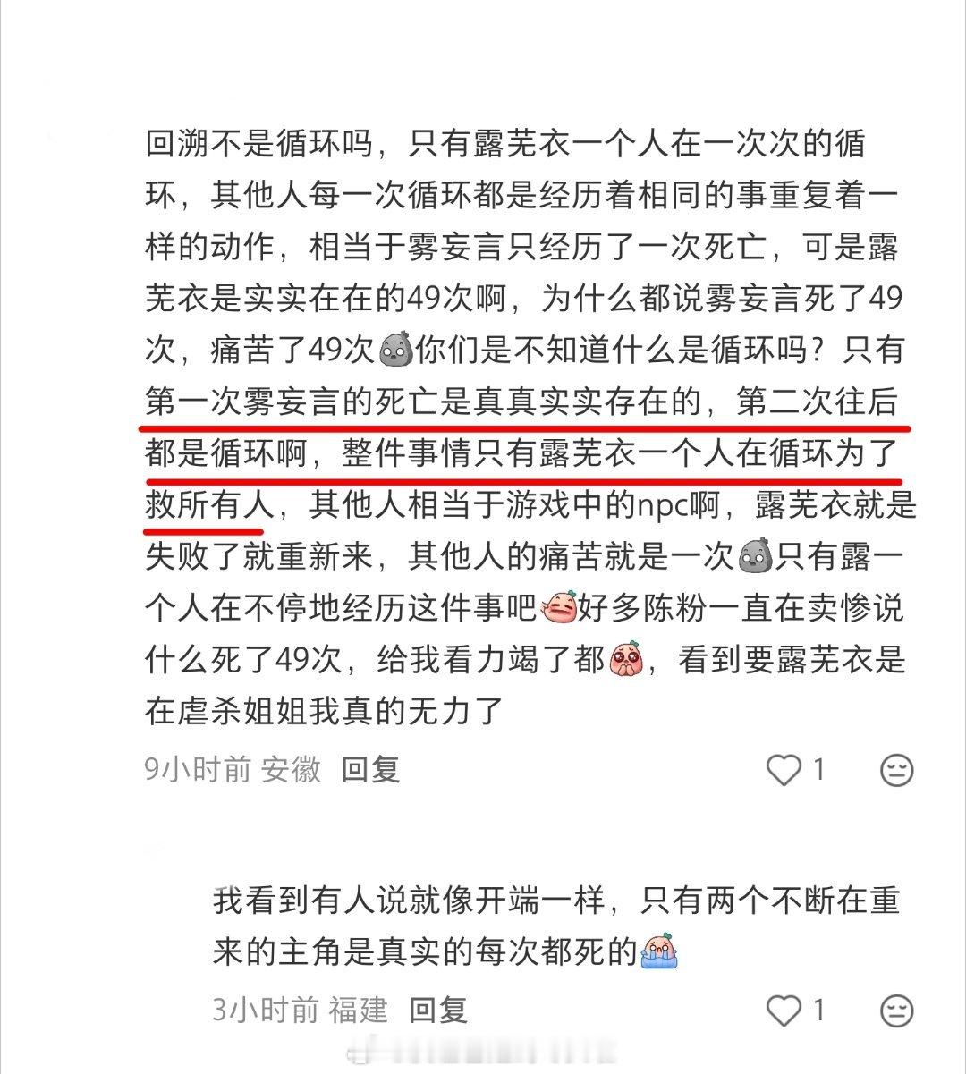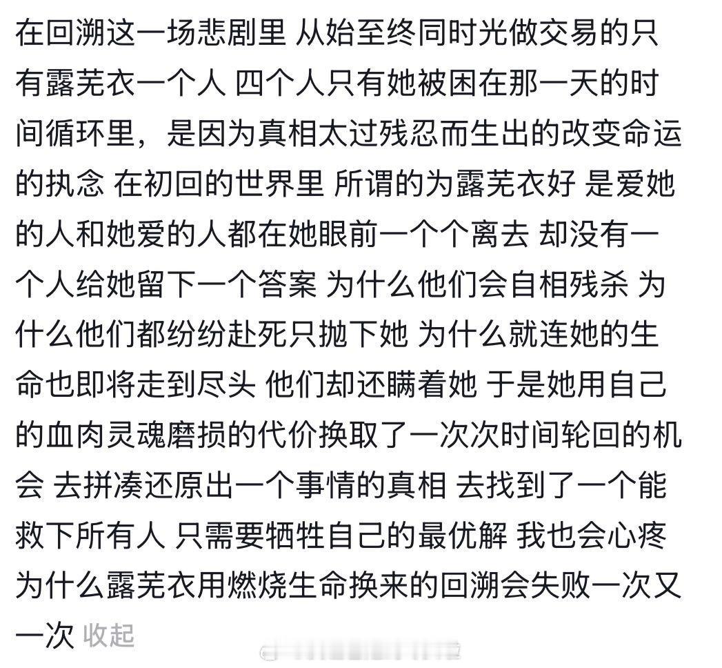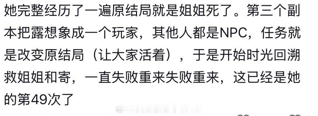 有网友说月鳞绮纪回溯副本把露芜衣代入游戏玩家就很好理解了,就像开端男女主一样,其实只有露芜衣独自一人经历了49次循环拯救所有人,回溯次数不等于真实别人的死亡次数,这一切都是从露芜衣视角出发的..天啊‼️