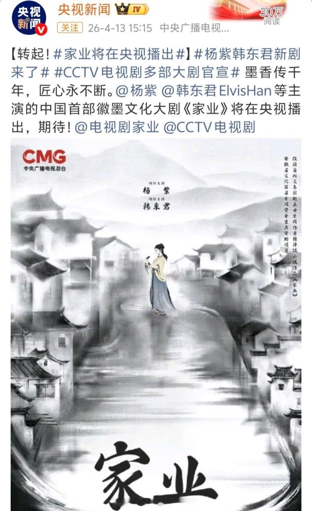 央视新闻官宣杨紫新剧《家业》将在央视播出