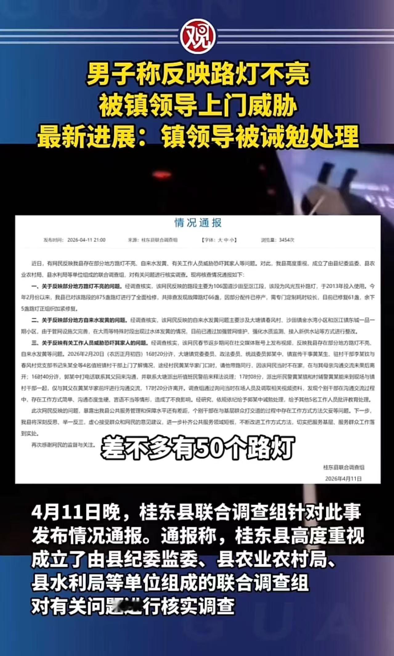 与此同时,当地也没有忽视村民最初反映的民生问题,今年 2 月以来就对辖区内 875 盏路灯开展全面检修,更换了故障路灯,针对自来水发黄的问题,也通过加强管网维护、强化水质监测、接入新供水站等方式完成整改,真正做到了既纠治作风问题,又解决民生难题。