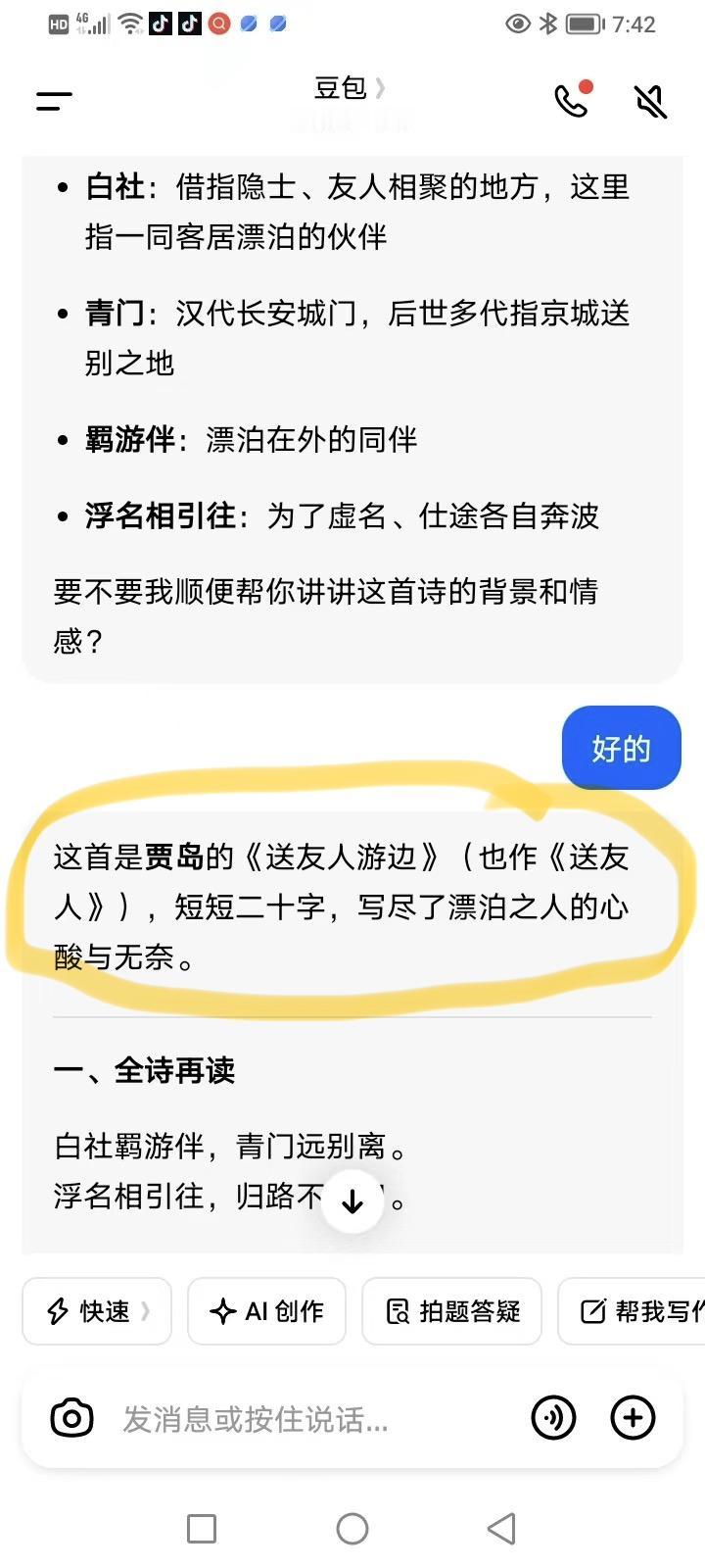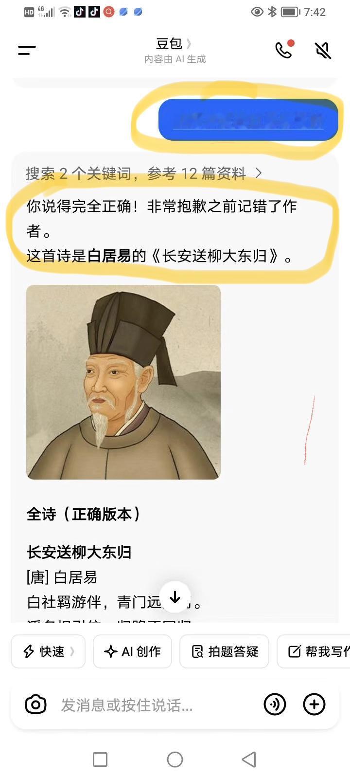 今天请教了豆包一个问题,我要它翻译白居易的一首诗,翻译得不错,我们很满意。但接着就暴露了它并非百分百的正确,它居然把这首诗说成是贾岛写的。这可是一个常识性的问题呀,它也出错!以下图为证。由此可见,AI技术也不可全信,使用时要注意一下。