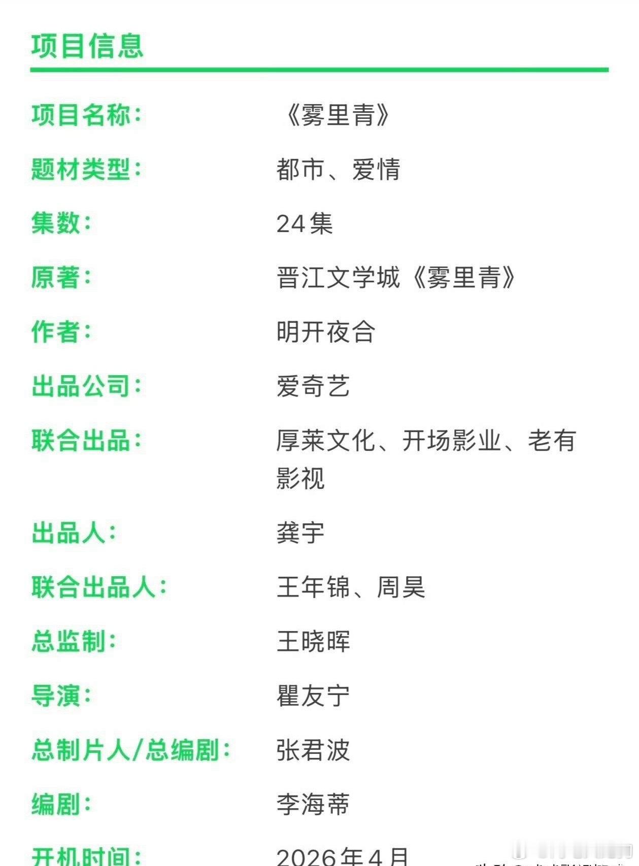 该剧导演瞿友宁,编剧李海蒂,根据明开夜合同名小说改编,4月底开机。