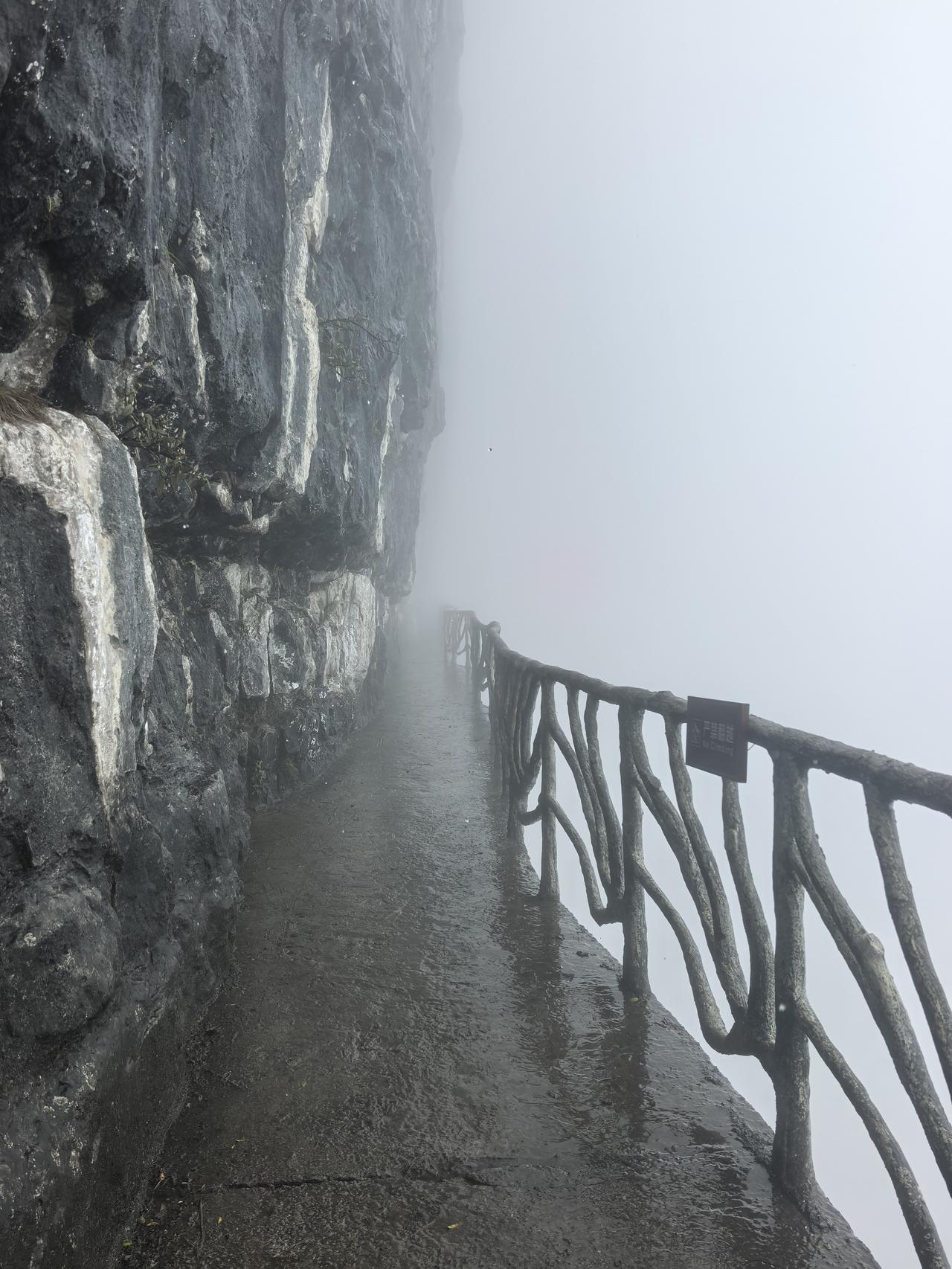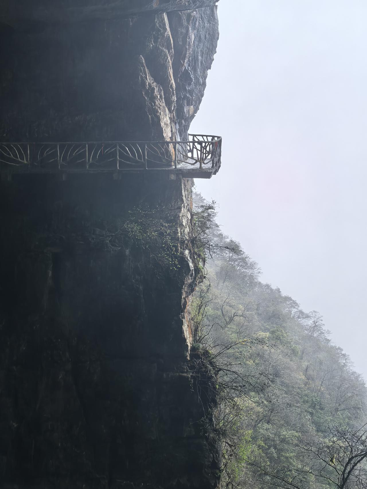 从金龟朝阳出发,我们冒雨踏上云端步道。这条栈道堪称险峻,全然在悬崖峭壁间凿壁而成,一侧是嶙峋山岩,一侧是万丈深渊。雨雾氤氲,人行其间,宛若踏云而行,少了几分诗意浪漫,多了些许惊心动魄,心跳始终悬着,步步都需小心谨慎。沿途途经燕子洞、灵观洞等天然溶洞,可穿洞而过,直达生态石林东入口,再步行返回北坡。考虑到山中游客稀少,我们二人相伴,便择另一条路前行,自三岔路口拐向生态石林西入口,经天池缓步走回北坡,最终乘缆车下山,返回停车场。
