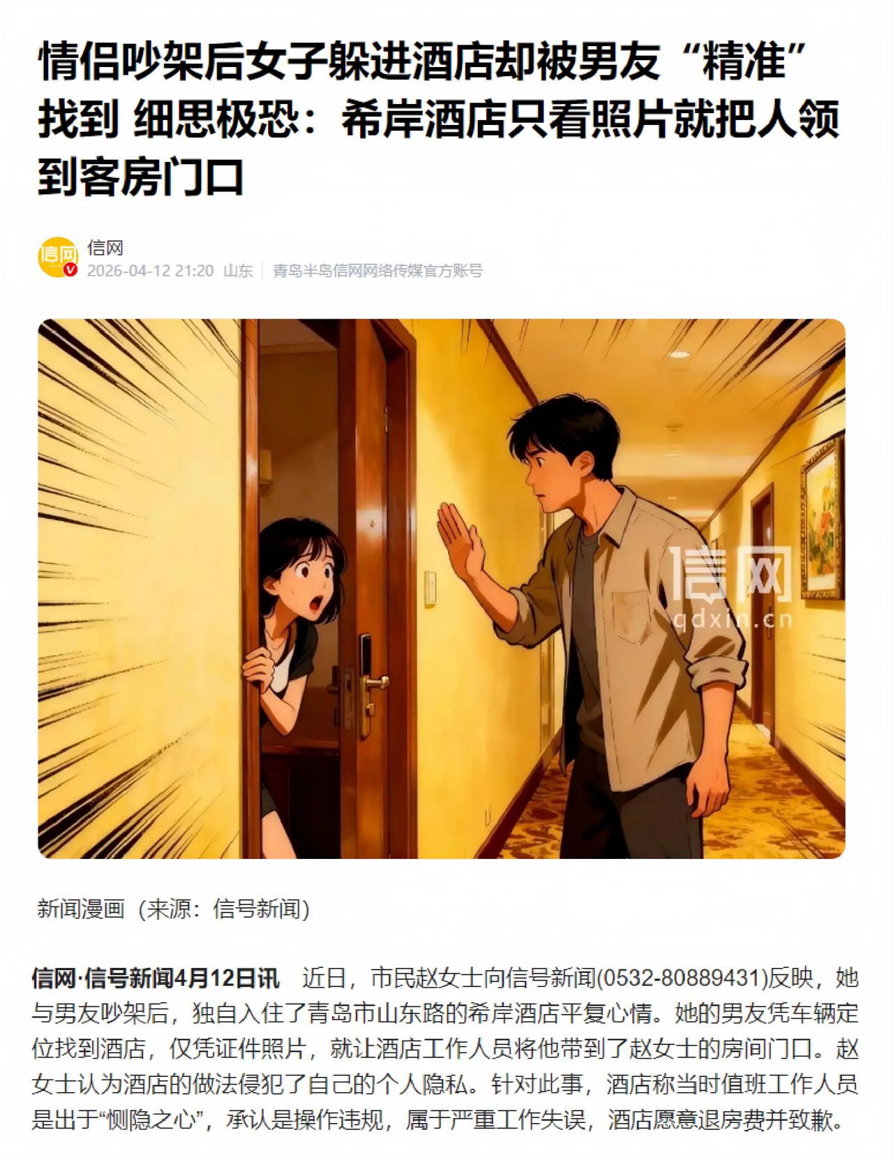 山东青岛,女子与男友吵架后离家出走,搬到附近酒店入住。结果还不到2小时,男友就敲了女子的房门。事后女子质疑酒店的安保存在严重问题,男友仅凭一张身份证照片,就在酒店前台问到了女子的具体房间号,连电话核实都没有。可酒店对此事的回应,却体现出了什么叫“双标”。