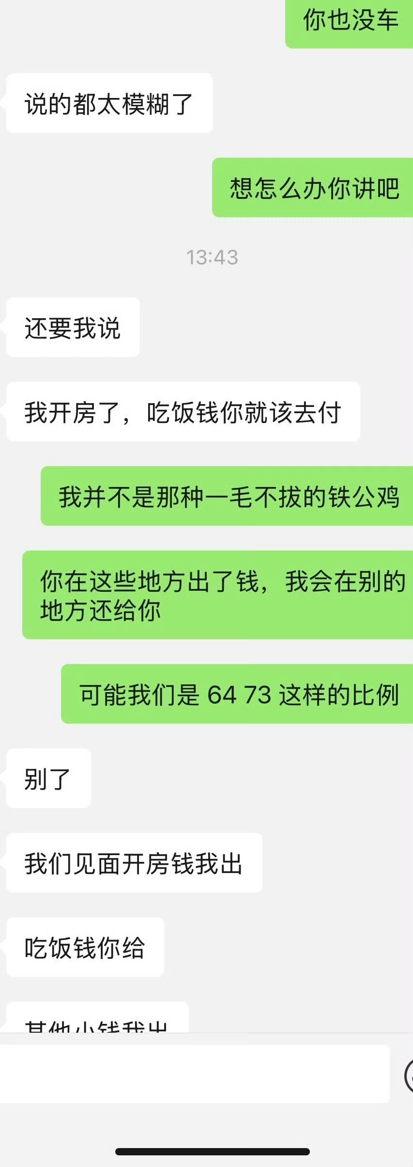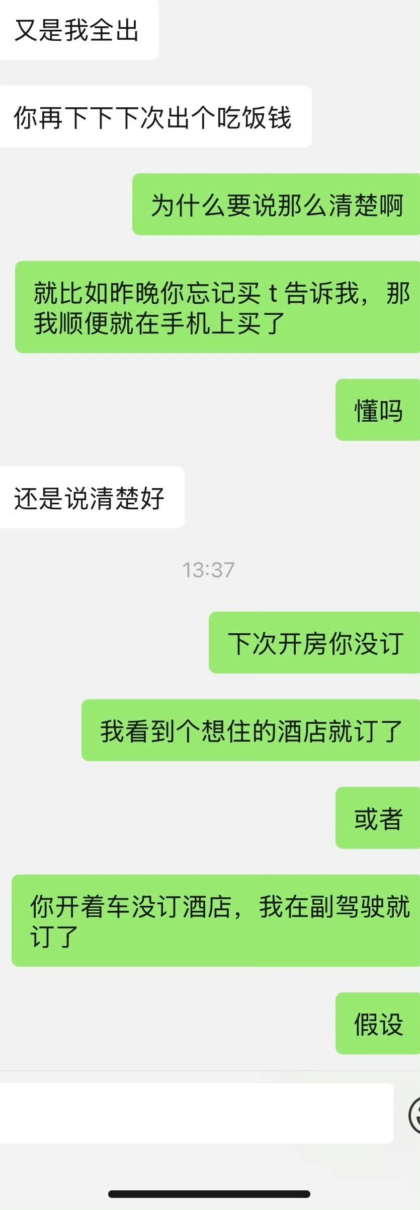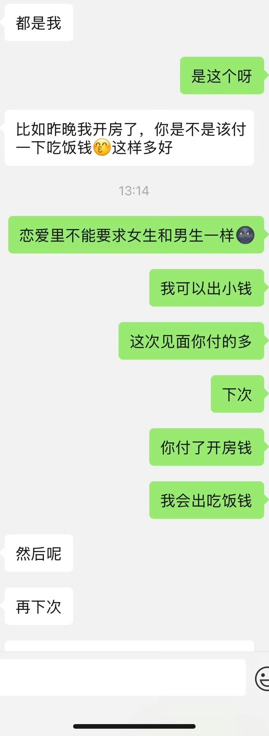 女子吐槽和男朋友出去住酒店,本来开开心心,事后男朋友却在微信上面和她说,以后酒店的钱他付,吃饭的钱就由女子来掏。说出来约会不能让他一个人掏钱,女子觉得不可思议。刚刚和男朋友确定关系,没想到他就整这么一出。他和以前任约会,大部分都是前任掏钱,她偶尔出一次两次钱。没想到新交的男友却如此的斤斤计较,每次连一两百两三百的费用,就受不了了。对于这样小气算计的男朋友,女子觉得难以接受。