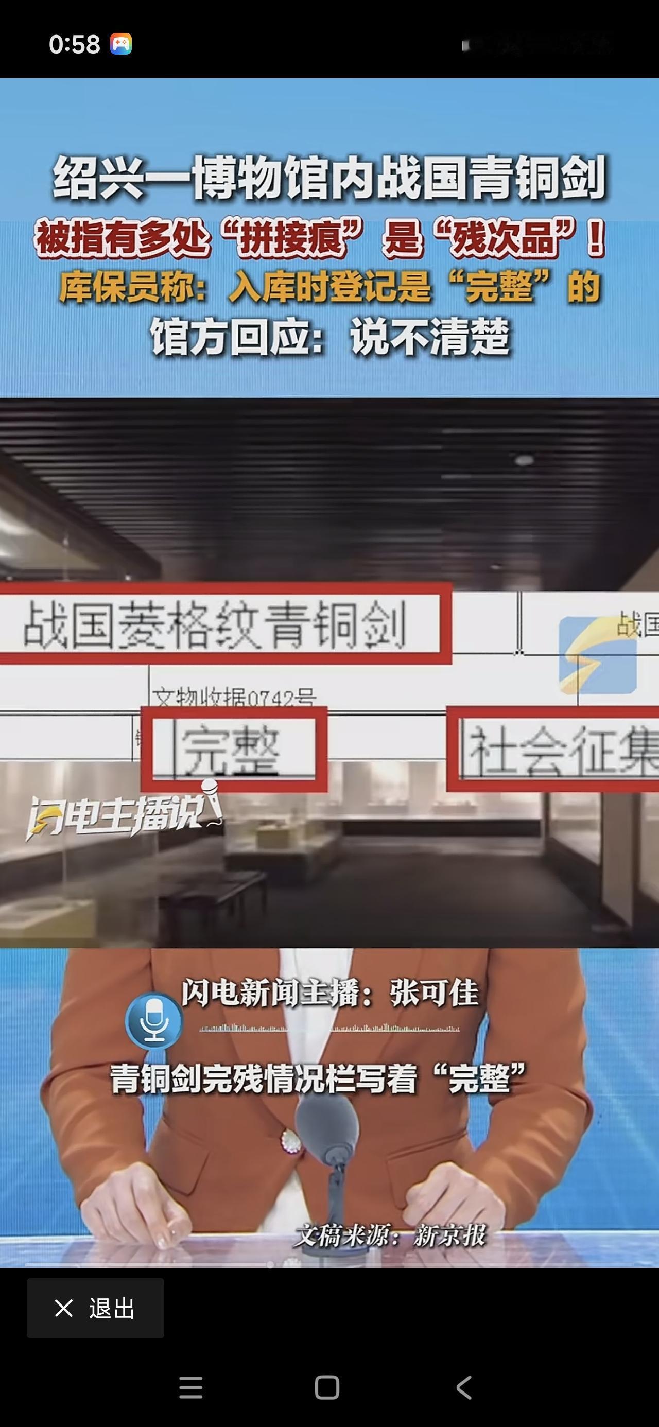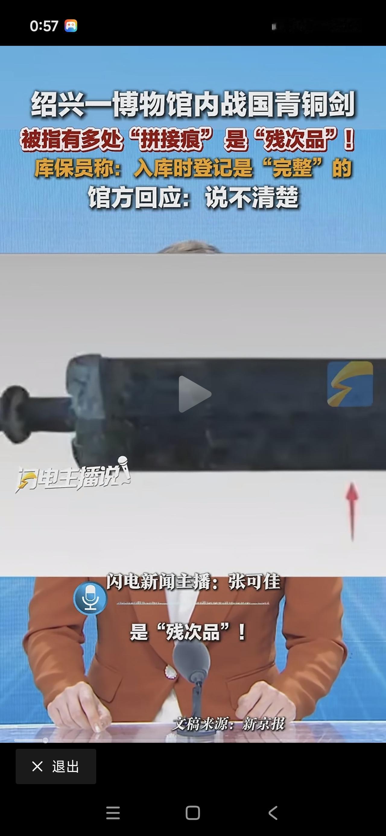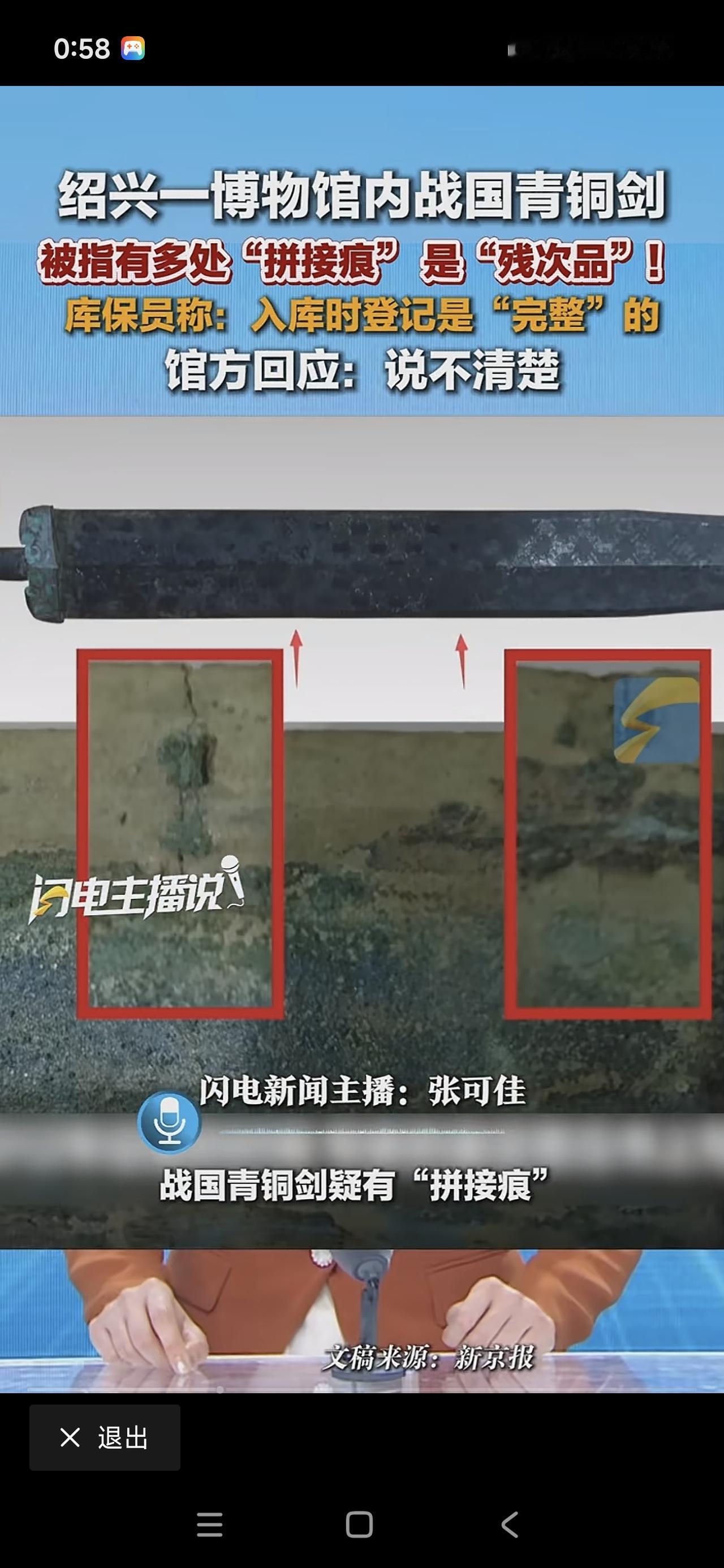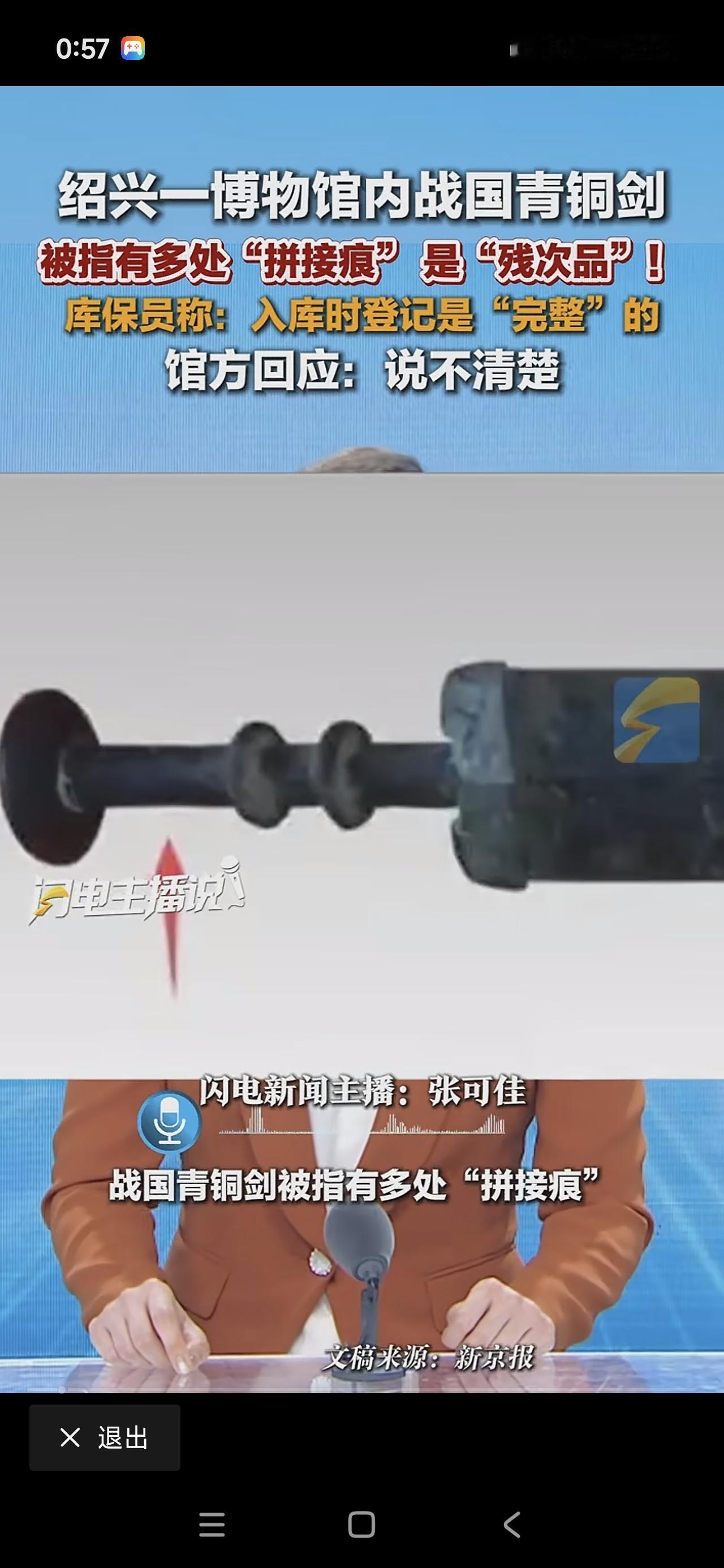 太炸裂!上次南京博物馆的倒卖文物事件还未平息,如今绍兴博物馆又出状况。在绍兴博物馆,一把战国青铜剑被发现多处断裂且有拼接痕迹,明显是残次品。入库保管员表示,入库登记时这把剑是完整的,而博物馆则称暂时不太清楚具体情况。希望有关部门能对各个博物馆来个大彻查。