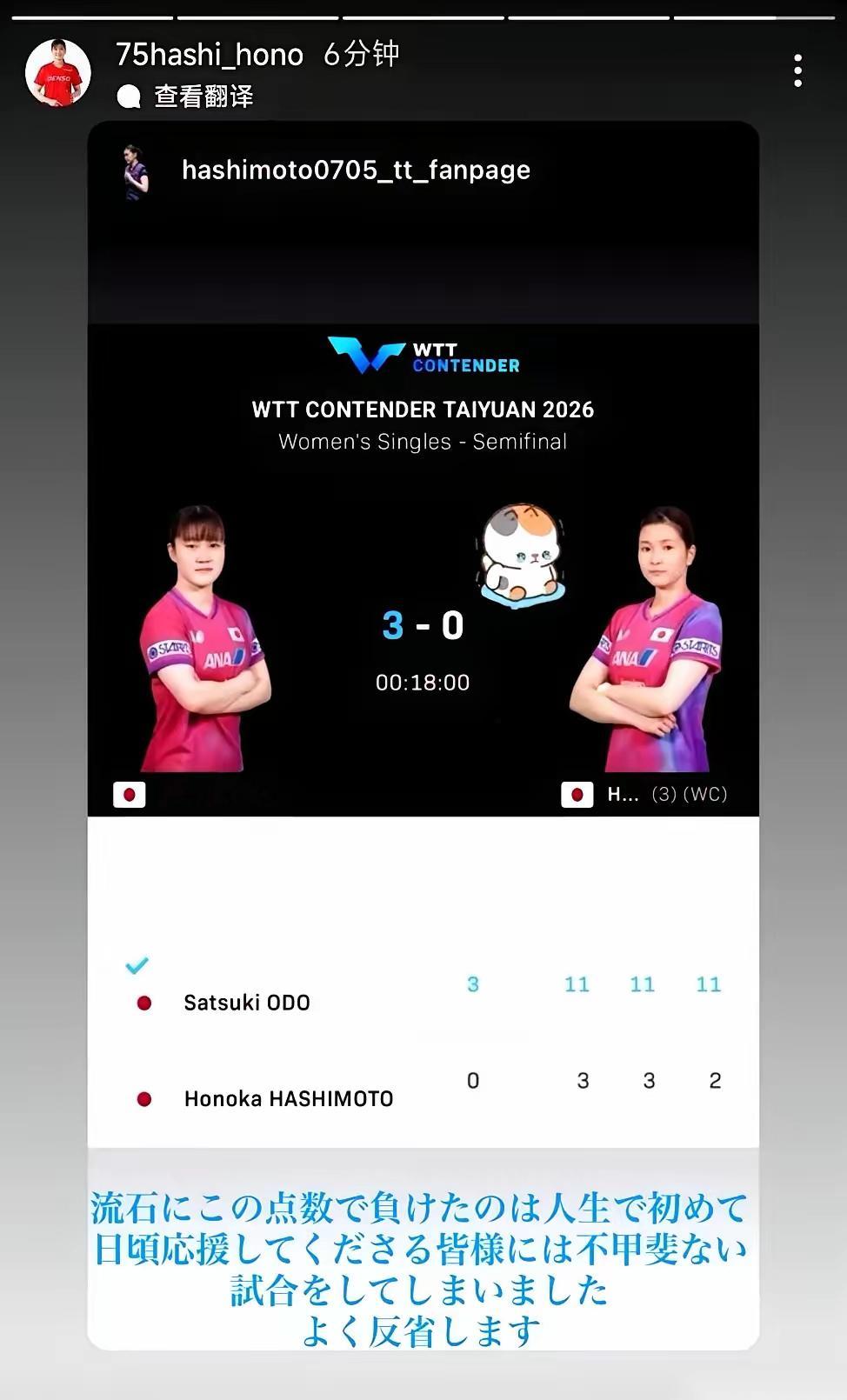 日本选手桥本帆乃香,刚打完太原站的比赛,自己发了条动态。
