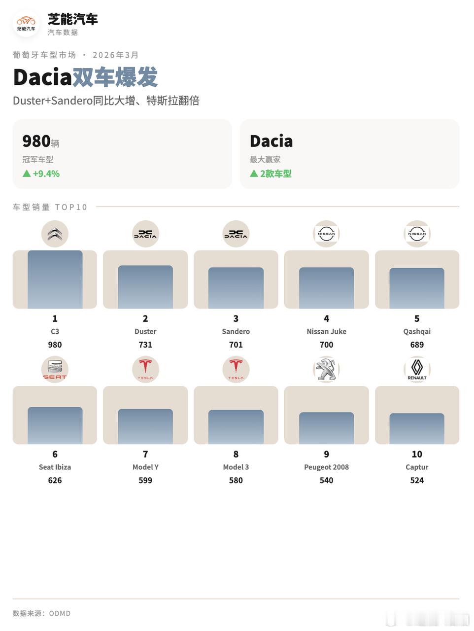 ◎ 紧随其后的是达契亚(Dacia),销量为1,871辆,凭借18.6%的同比增长,市场占有率达到7.0%,葡萄牙消费者也开始买便宜车。