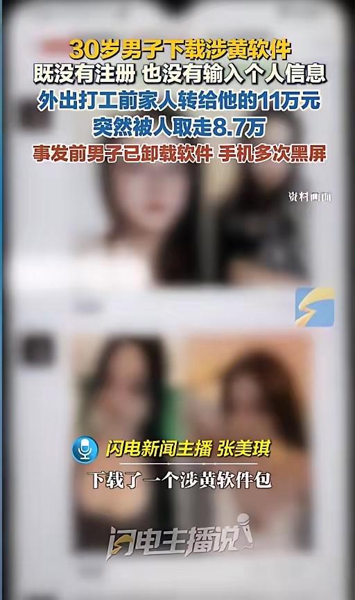 “色字头上一把刀!”近日,陕西,一外来打工男子闲着没事,刷起了手机,在公众号的引导下,下载了一个黄色软件。可是试了试却打不开,他就又下了另一个。没想到这之后,手机就多次黑屏,第二天发现自己的8.7万没有了!网友:活该啊!