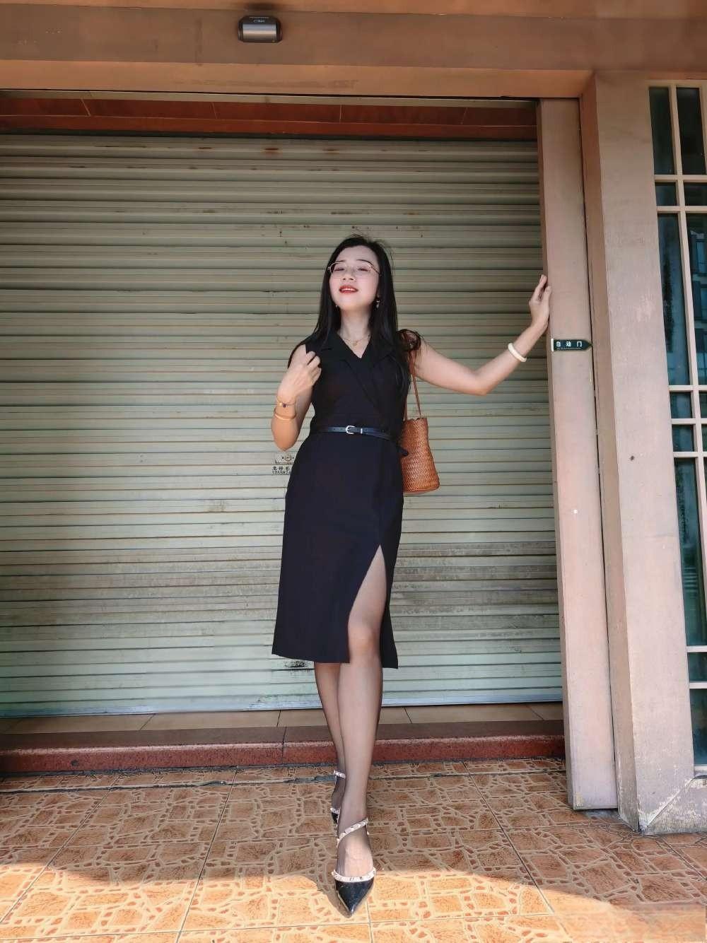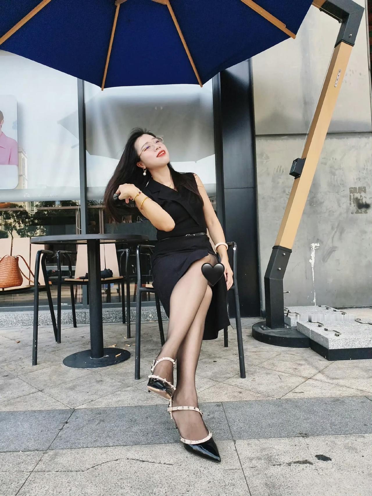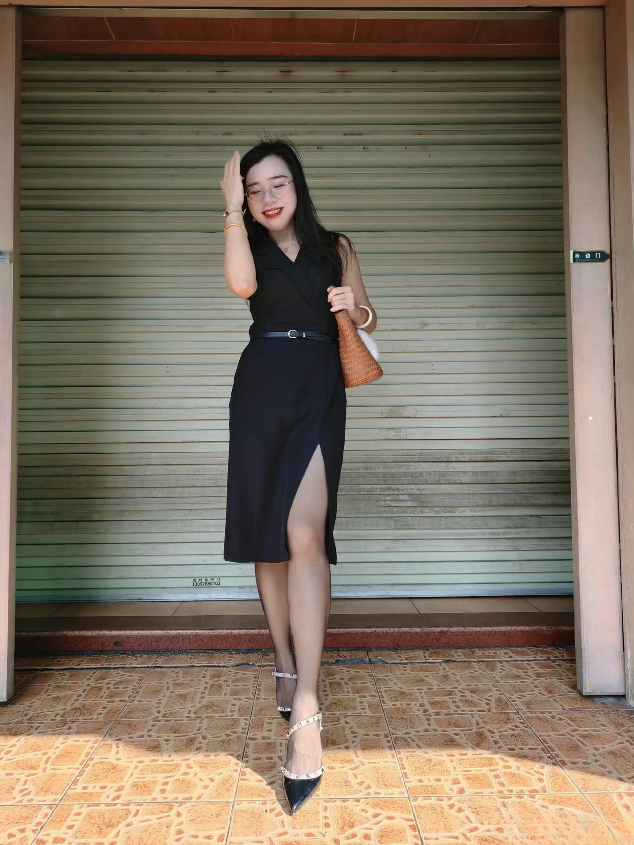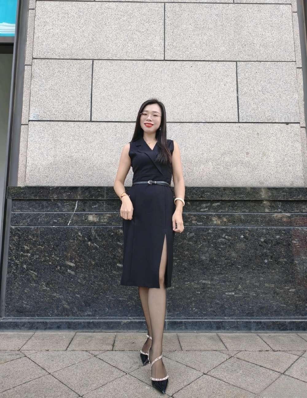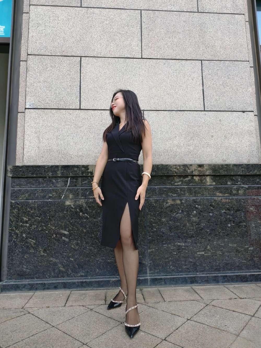 - 单品选了黑色无袖收腰连衣裙,V领+收腰版型显身材,侧边开叉细节增加魅力,无袖设计适配温和天气,简约又利落;