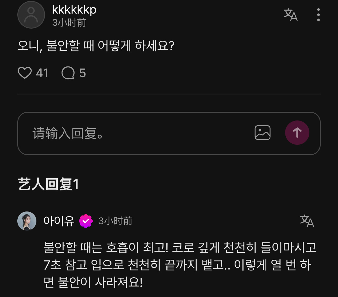 爱娜:姐姐你感到焦虑的时候会怎么做?IU:不安的时候呼吸是最好的! 用鼻子慢慢吸气,忍住7秒,用嘴慢慢吐到最后... 这样十次焦虑就会消失!