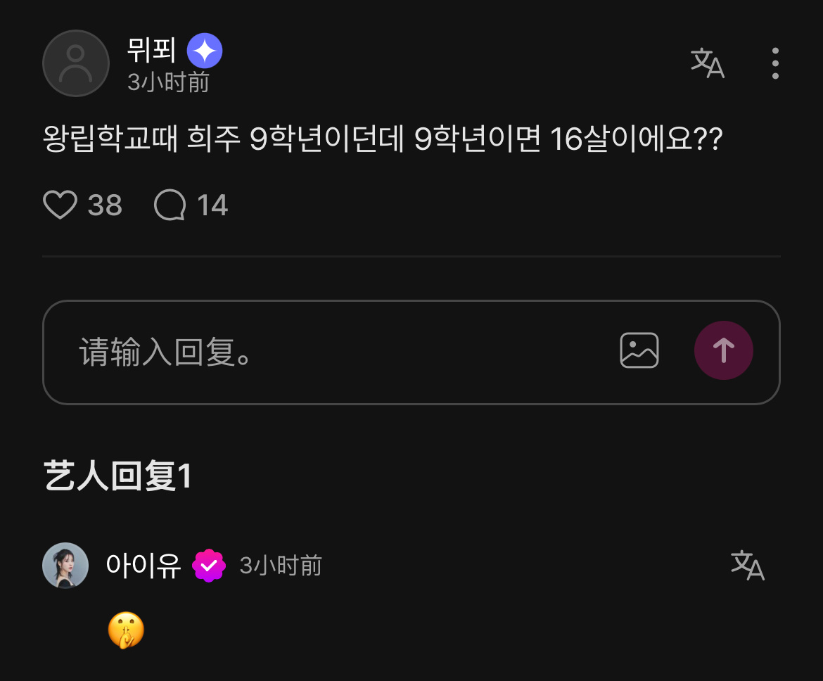 爱娜:在皇家学校的时候熙周是9年级,9年级的话是16岁吗??IU:🤫