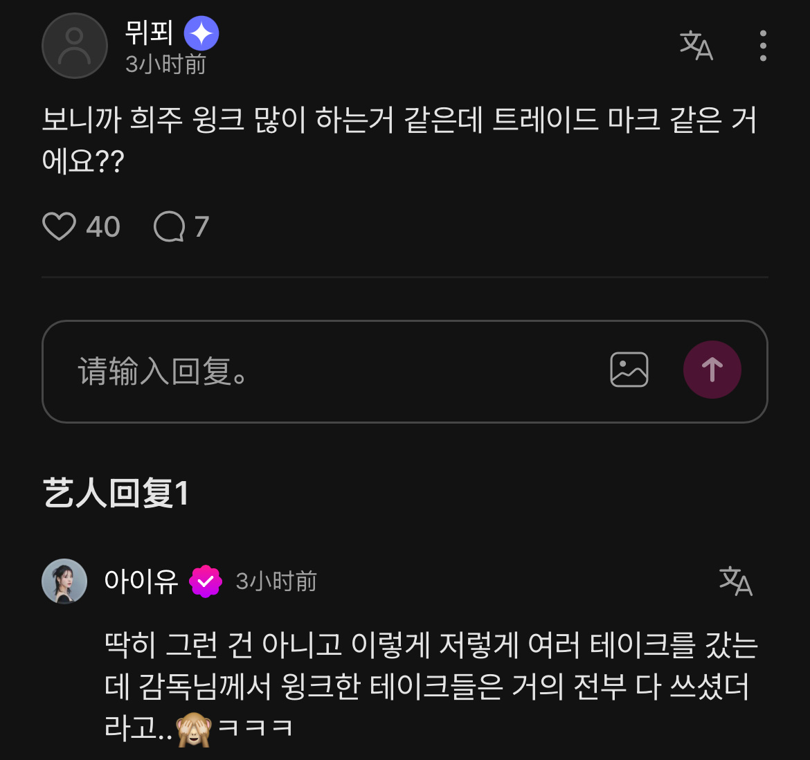 爱娜:我看熙周好像经常眨眼 是像标志一样的吗?IU:其实不是这样的,我们拍了好几遍,但导演最后几乎用了我眨眼的每一个镜头……🙈