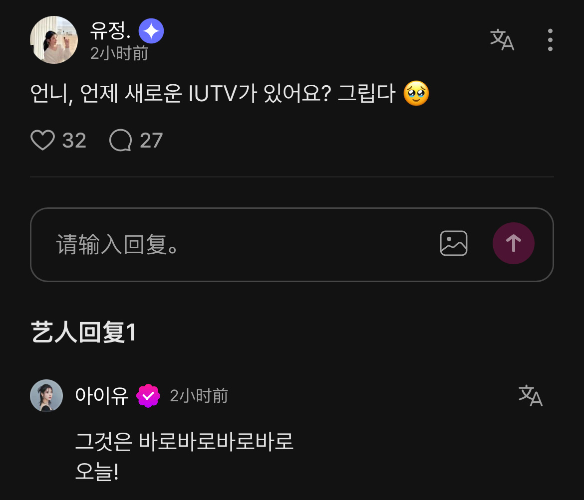 爱娜:姐姐,什么时候有新的IUTV? 想念🥹IU;那个就是 就是 就是 就是 就是 今天!
