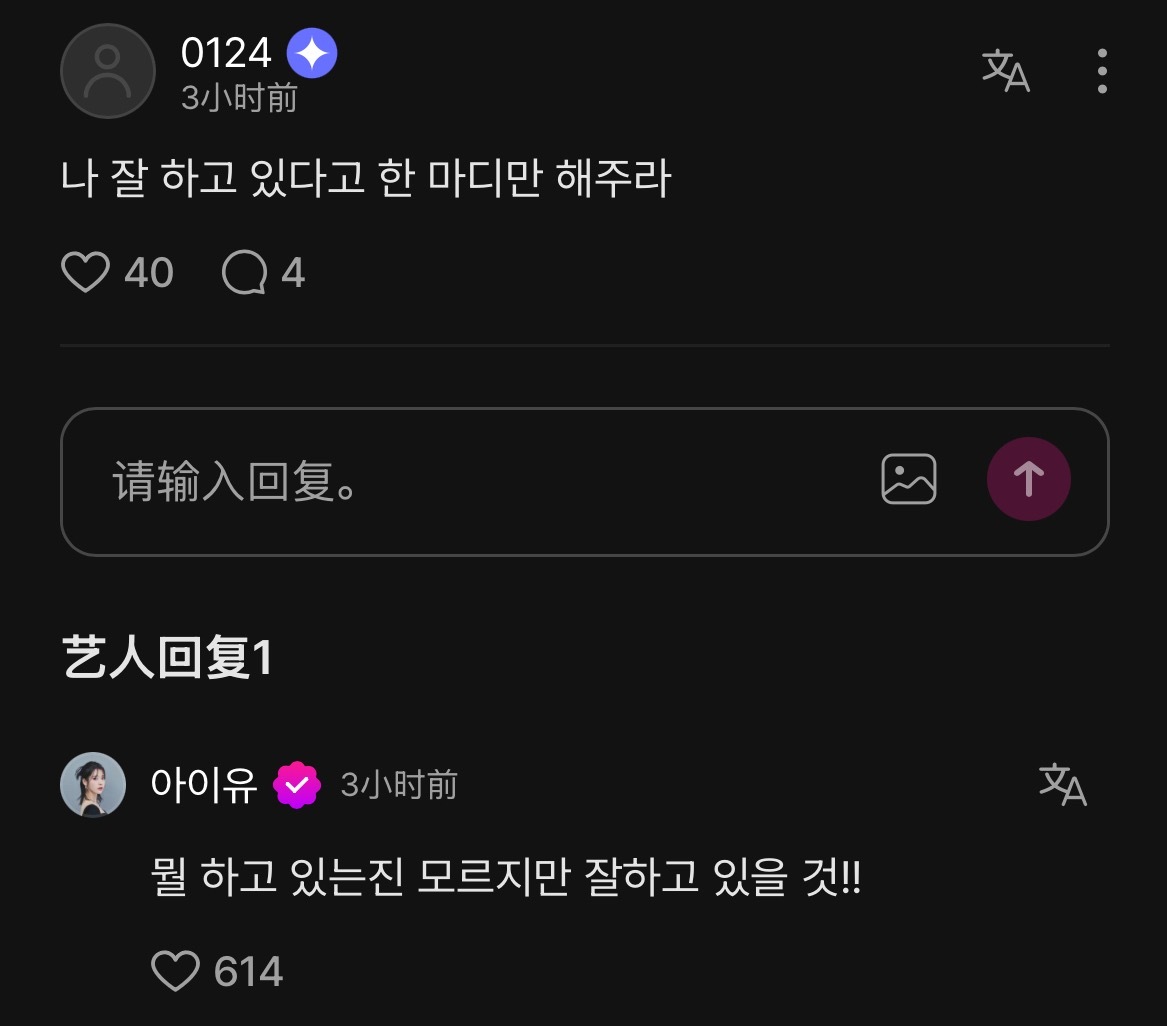 爱娜:姐姐,新专辑进行到哪里了? 80%90%100%200%?💽IU:虽然很想加进去,但是有一个不太顺畅的歌词,所以正在苦苦挣扎中🙂↕️