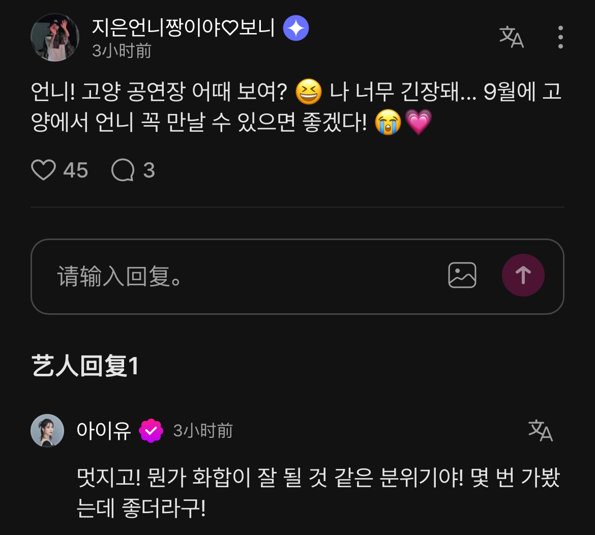 爱娜:姐姐!高阳公演场看起来怎么样? 😆我太紧张了... 希望9月在高阳一定能见到姐姐!😭💗IU:很帅气!感觉会很合得来! 去过几次,挺好的!