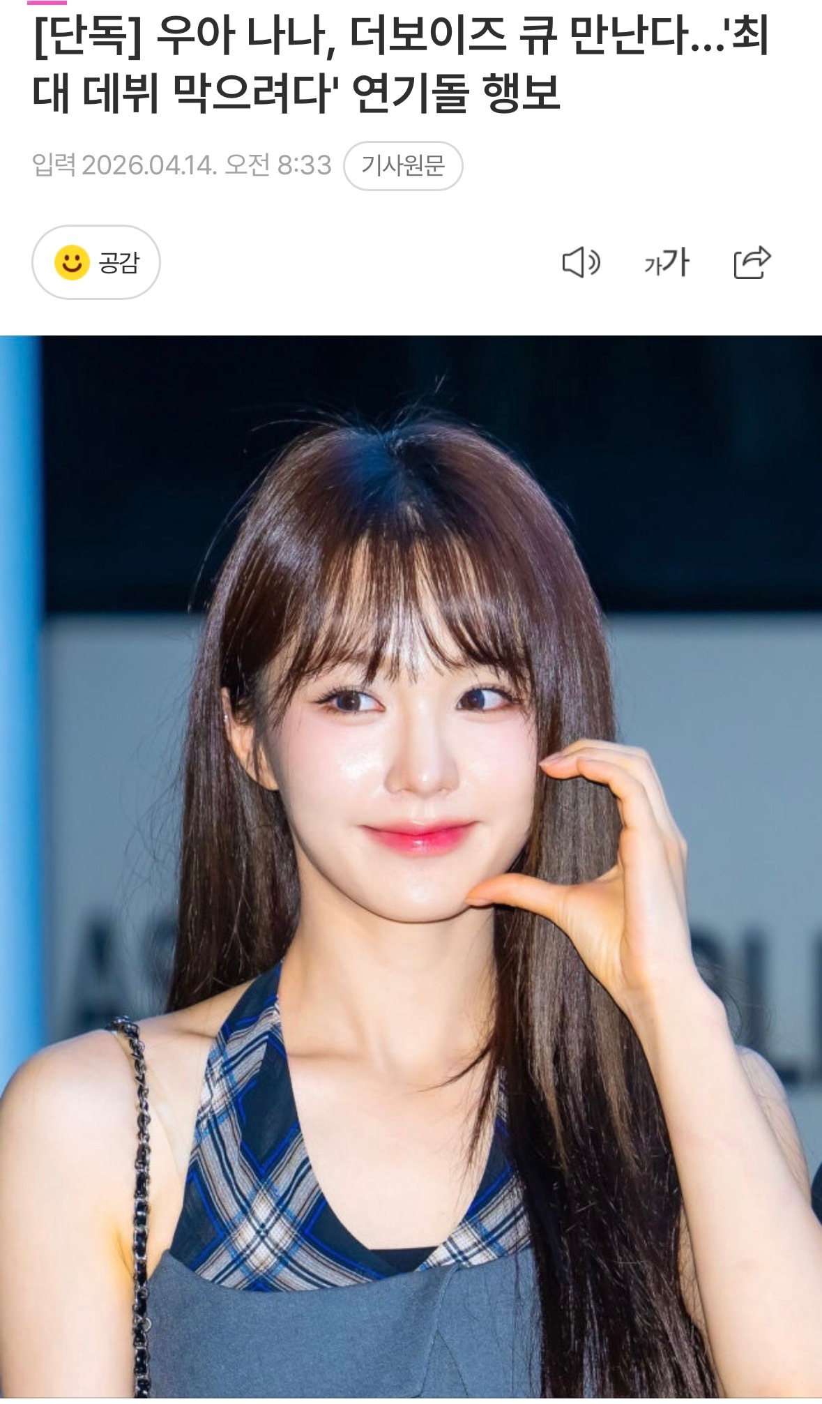 WOOAH Nana x THE BOYZ Q将合作出演新剧《阻止最爱出道,结果我出道了!》 14日OSEN采访结果,Nana将出演新剧《阻止最爱出道,结果我出道了!》。 Nana将在剧中担任雅智一角,现在已经开始了拍摄。之前The Boyz Q也宣布了出演,两人的演技配合备受期待。