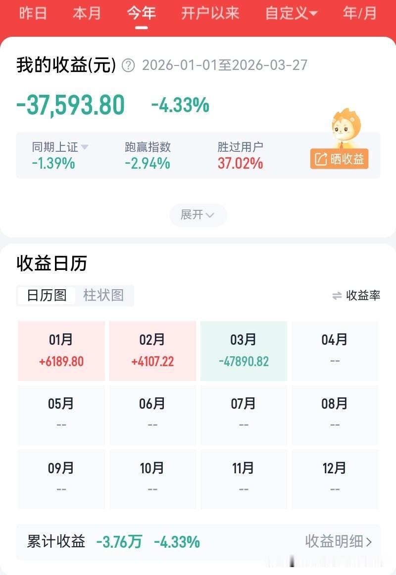 结果眼瞅着3月份进入尾声,账户仍然飘绿,今年亏损3.6个W。