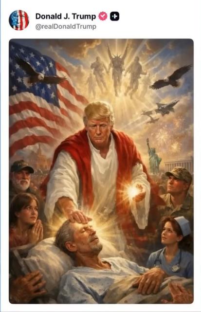 更离谱的是那张AI图。他把自己塑造成耶稣,手放病人头上显神迹,背景还插满美国国旗、白头鹰。宗教界直接炸锅,天主教高层痛批这是亵渎,连MAGA内部大佬都站出来骂“令人发指”“上帝不会被嘲弄”。