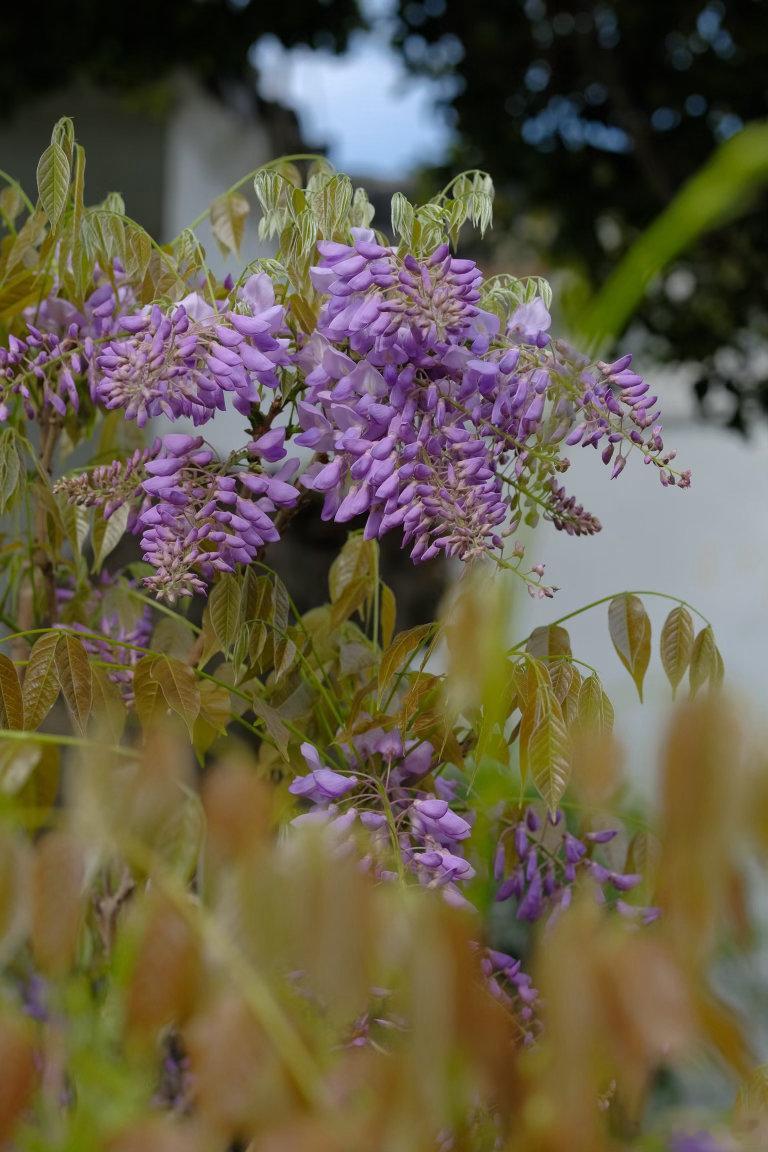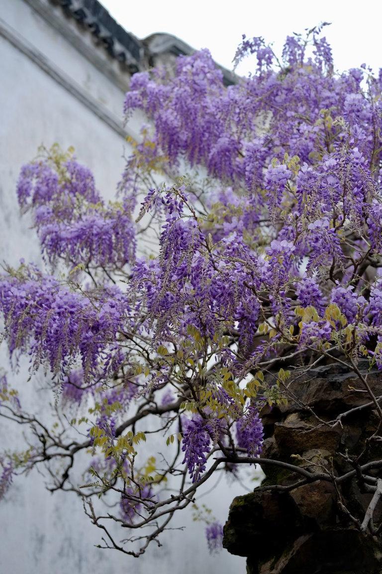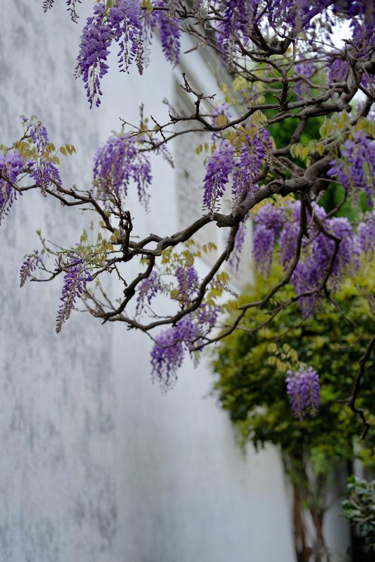 白墙黛瓦间,紫花如瀑垂落,哪怕是细雨绵绵的天气,这抹灵动的紫也足够鲜活亮眼。