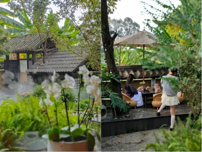 1、核心记忆点:大树+水雾缭绕的造景,二楼木窗是视觉锚点,“一步一景”的空间设计让每个角落都出片;