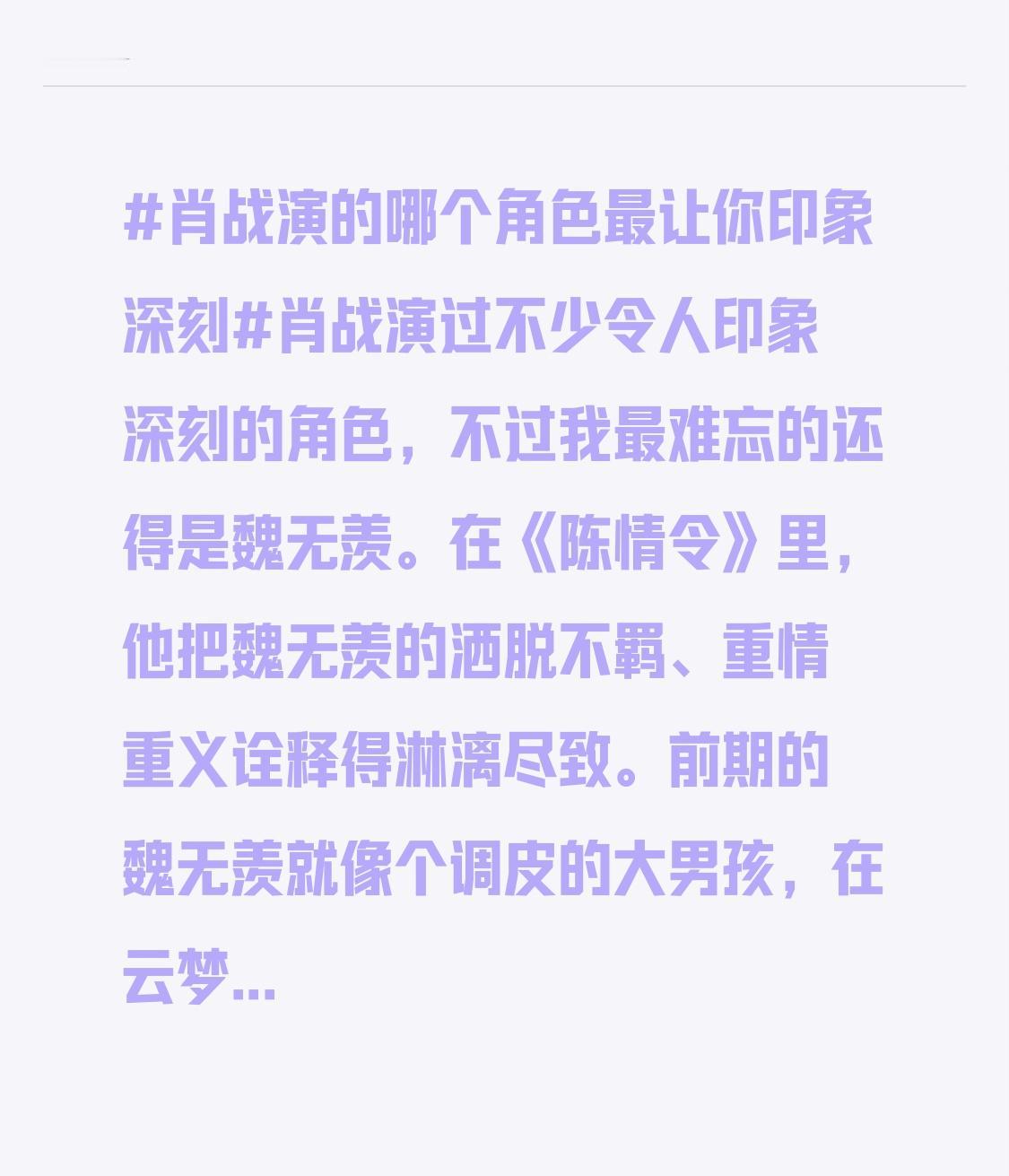 肖战演过不少令人印象深刻的角色,不过我最难忘的还得是魏无羡。在《陈情令》里,他把魏无羡的洒脱不羁、重情重义诠释得淋漓尽致。前期的魏无羡就像个调皮的大男孩,在云梦有师姐的疼爱、江澄的陪伴,日子过得肆意潇洒。后来经历种种变故,他的眼神里又多了几分沧桑和无奈。比如在乱葬岗那段,他的挣扎与坚持都让人心疼。还有他吹笛御尸的名场面,真的太有仙侠范了。魏无羡这个角色就像有血有肉般存在,肖战赋予了他灵魂,让人一看就忘不了。