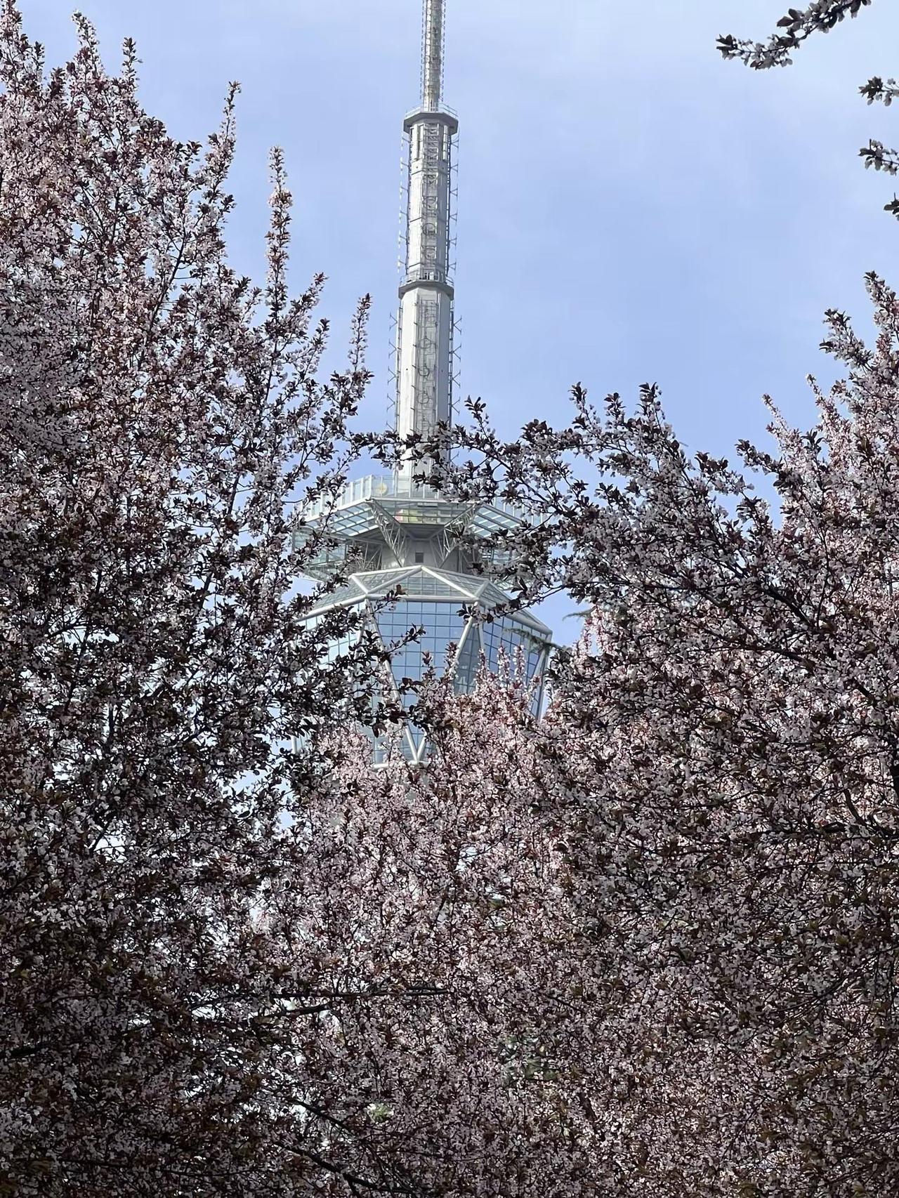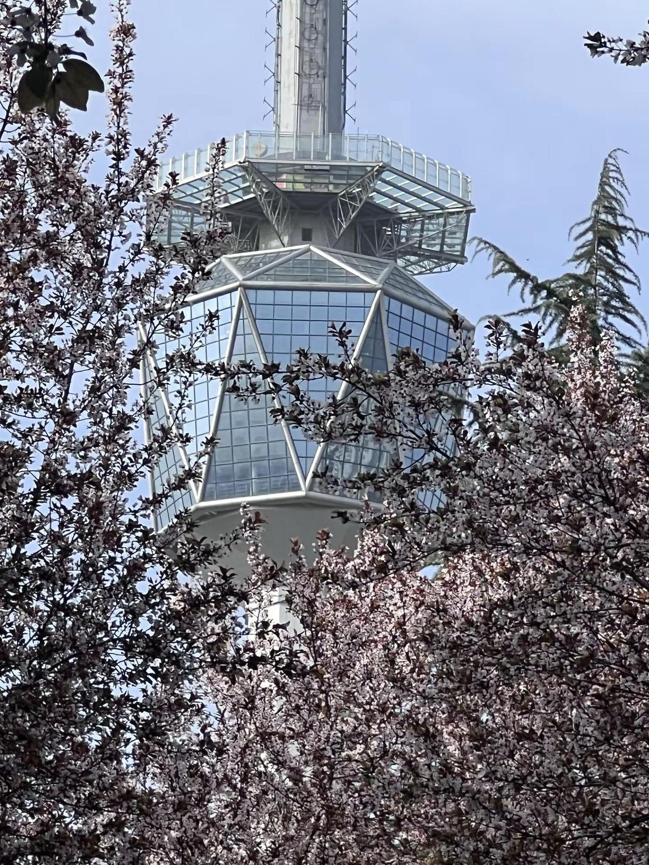 西安春日浪漫:电视塔×紫叶李 西安电视塔紫叶李开爆了!春日顶流机位风一吹,花瓣就