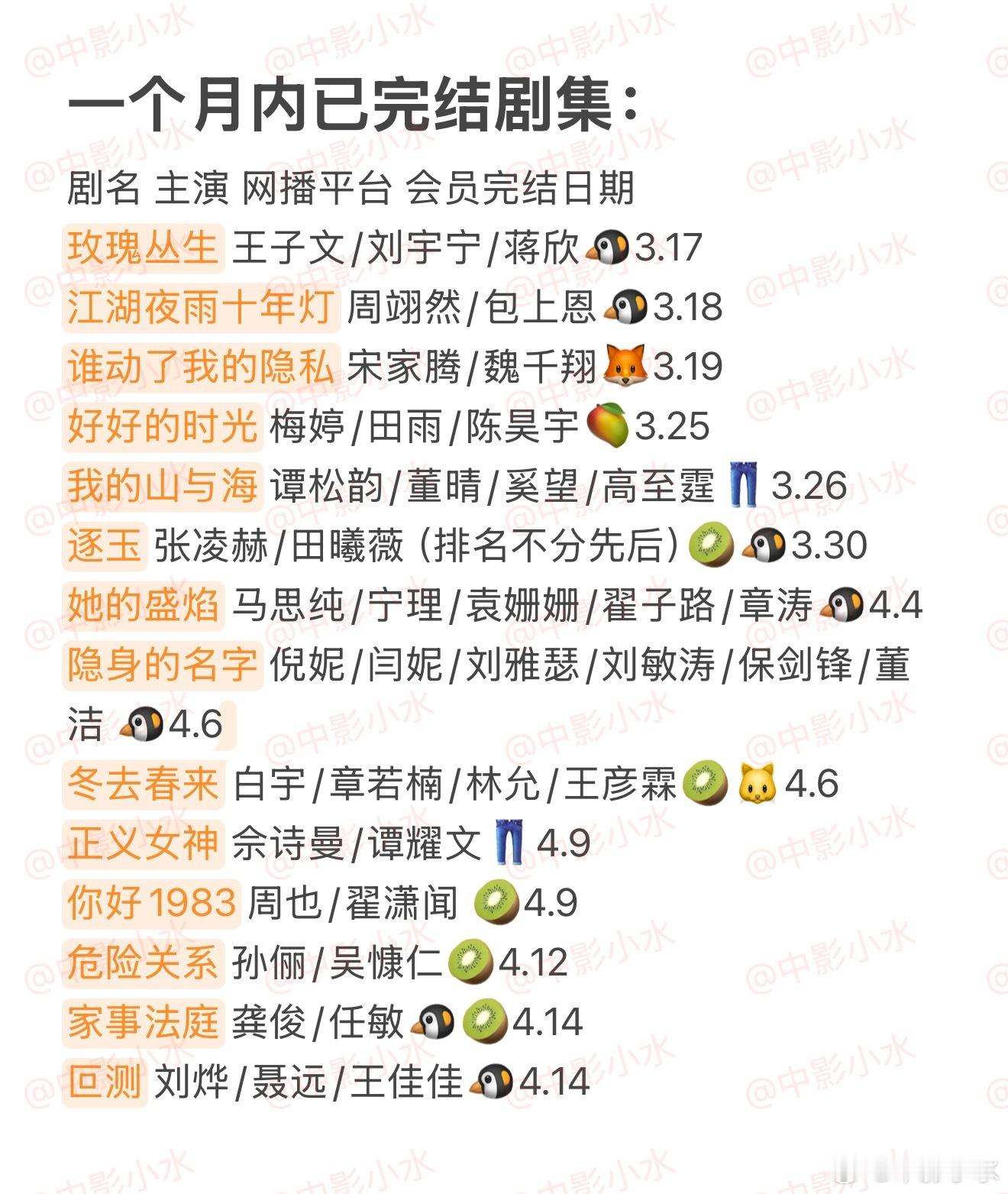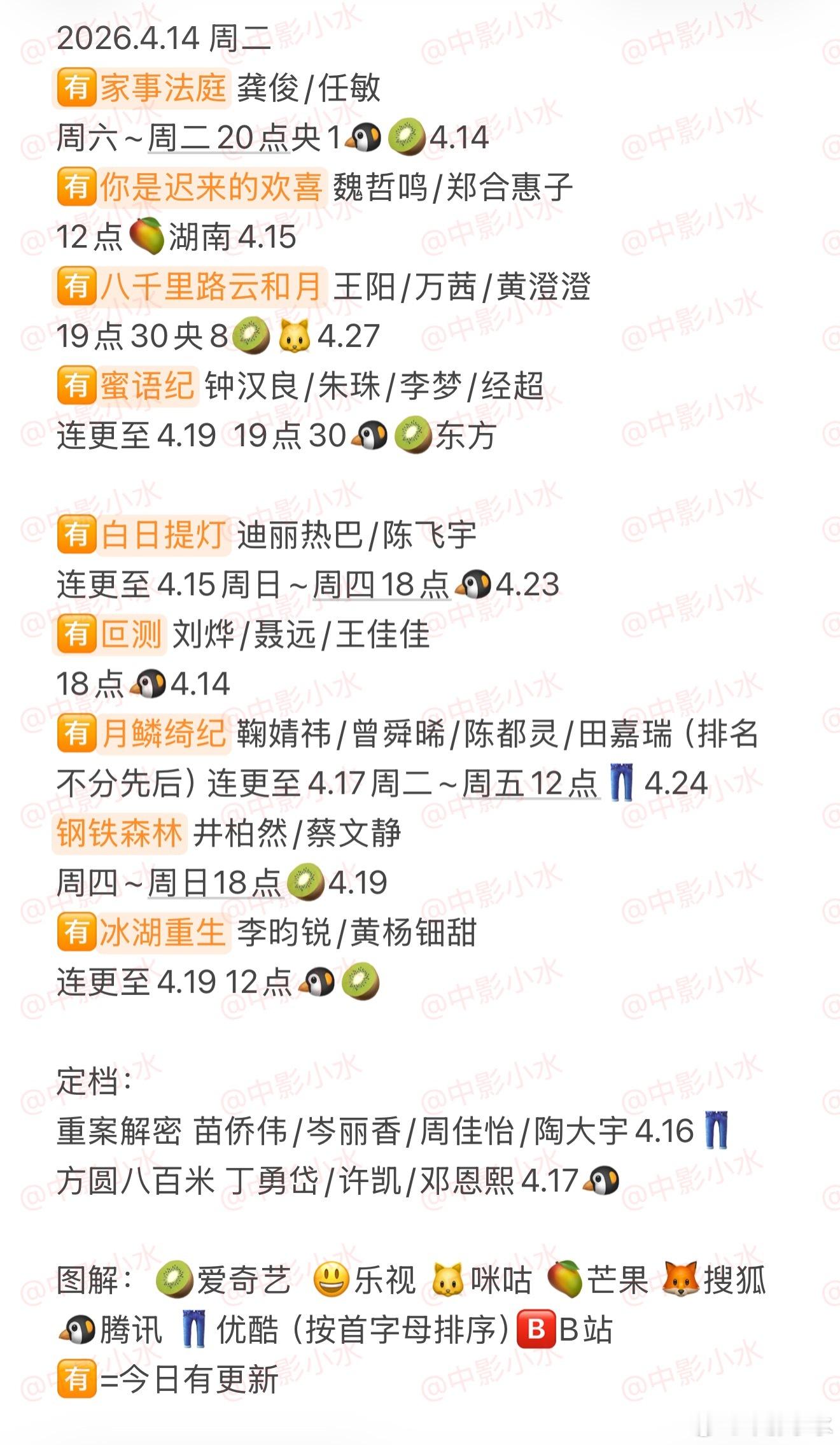 拯救剧荒 4月14日,今晚看点啥??图1 追剧日历 图2 综艺日历 图3 已完结剧集 🈶家事法庭 龚俊/任敏🈶你是迟来的欢喜 魏哲鸣/郑合惠子🈶八千里路云和月 王阳/万茜/黄澄澄🈶蜜语纪 钟汉良/朱珠/李梦/经超