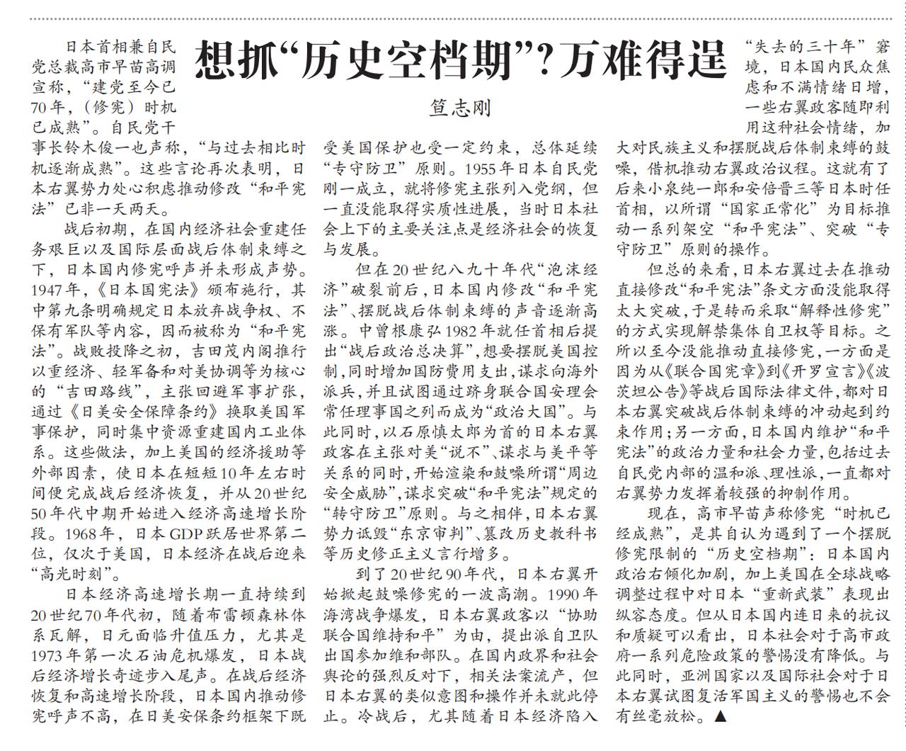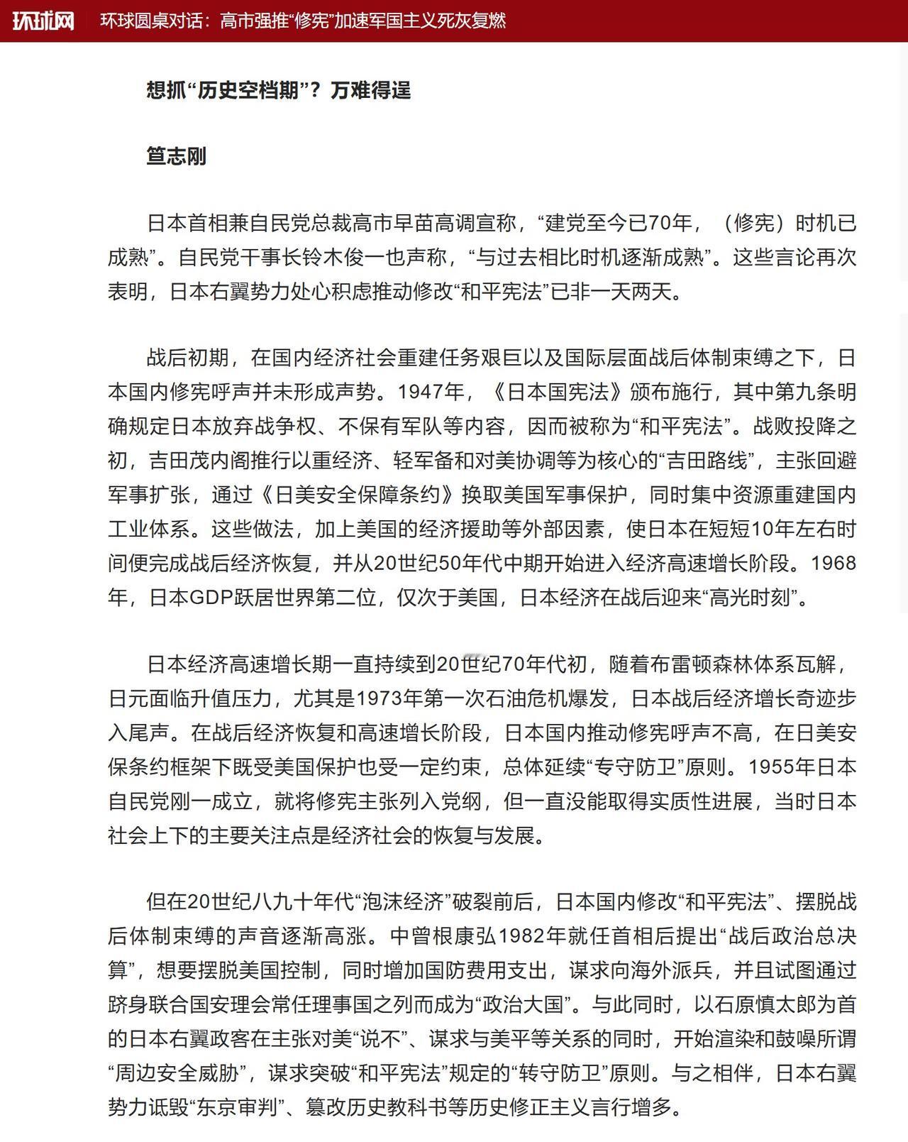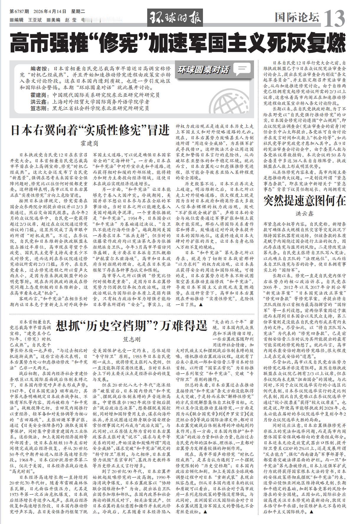 【环球圆桌对话:高市强推“修宪”加速军国主义死灰复燃】2026年4月14日,《环球时报》环球圆桌对话以“高市强推“修宪”加速军国主义死灰复燃”为题,配以“日本首相兼自民党总裁高市早苗近日高调宣称修宪“时机已经成熟”,并且开始加速推动修宪进程由政策宣示转入条文讨论阶段。这在日本国内遭到质疑,也进一步引发地区和国际社会警惕。本期“环球圆桌对话”就此展开讨论”的编者按,邀请了中国现代国际关系研究院东北亚研究所研究员霍建岗、上海对外经贸大学国际商务外语学院学者洪云鑫、黑龙江省社会科学院东北亚研究所研究员笪志刚分别以《日本右翼向着“实质性修宪”冒进》、《突然提速意图何在》、《想抓“历史空档期”?万难得逞》为题对高市强推“修宪”新动向予以批判。