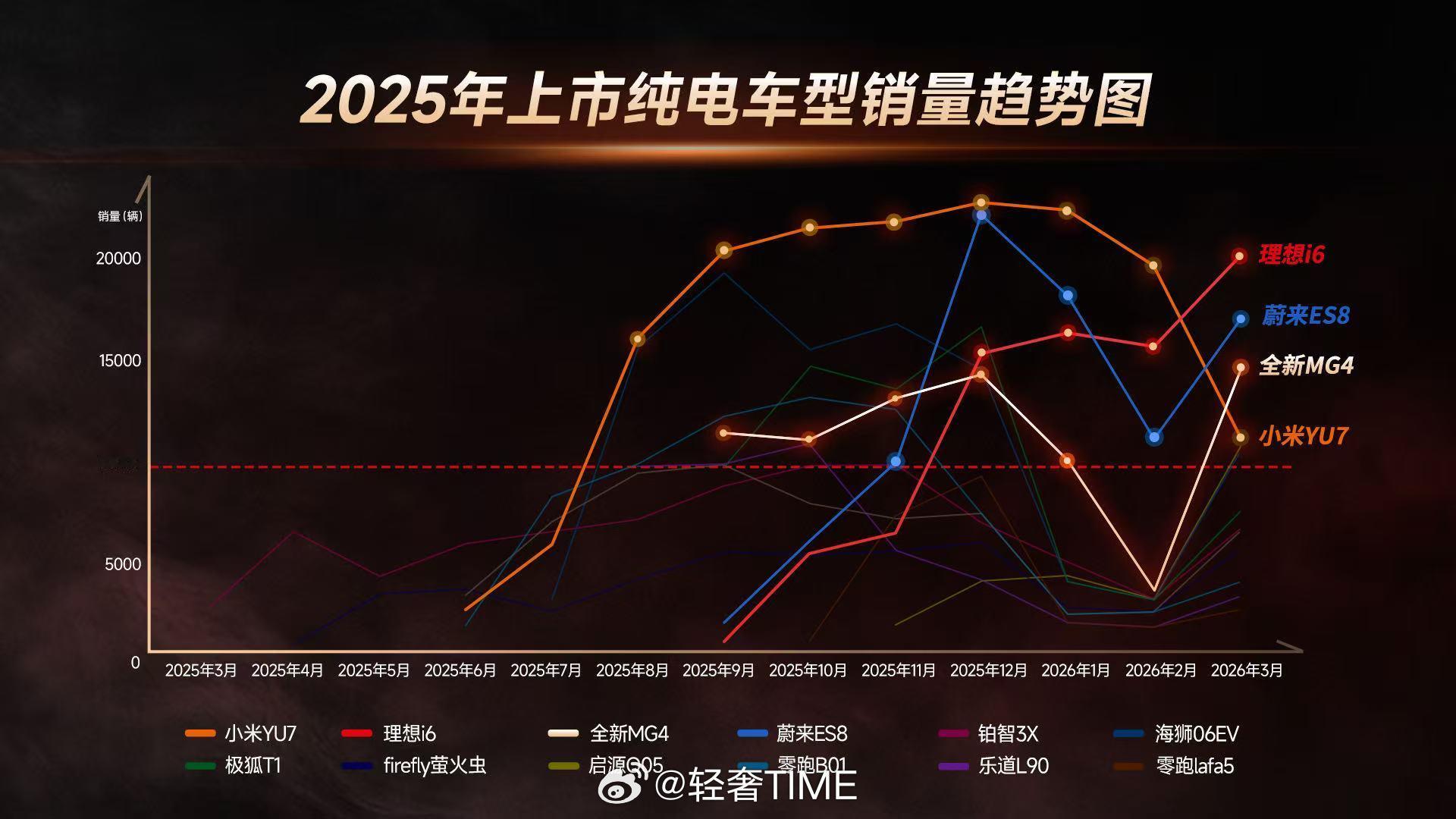 百款新车仅4台纯电爆款 在2025年上市的百余款纯电新车中,真正穿越“火不过三个月”周期的爆款仅有四款:小米YU7、理想i6、蔚来ES8和全新MG4。它们成功的逻辑各不相同——小米YU7靠极致稀缺与强社交属性满足年轻用户情绪价值;理想i6深耕家庭场景,以口碑和实用性取胜;蔚来ES8凭借大空间、换电及家用商务双场景突围;全新MG4则践行技术普惠,将半固态电池等高端配置下放至10万级市场,用实在产品力打动用户。四款车型中,全新MG4凭借最低的价格门槛和最广泛的受众基础,销量预计最高。