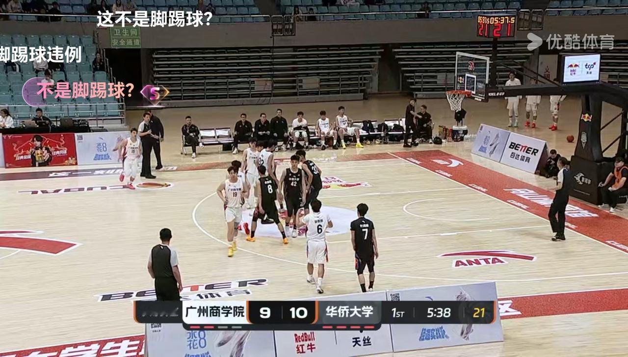 关于裁判的判罚总能引起这样,那样的说法。广州商学院的替补席还吃了一个T,