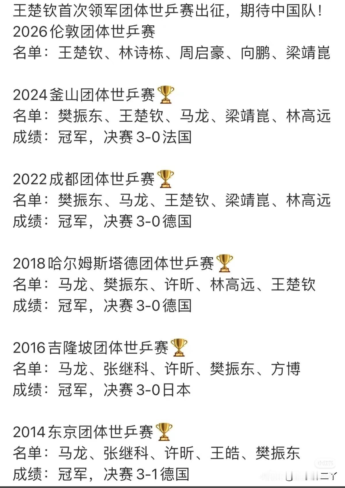 2014年到2024年,5次团体赛,都是国乒夺得冠军,每次至少有2-3个绝对主力,谁上场都有不低的胜率,这样的阵容才让人安心。