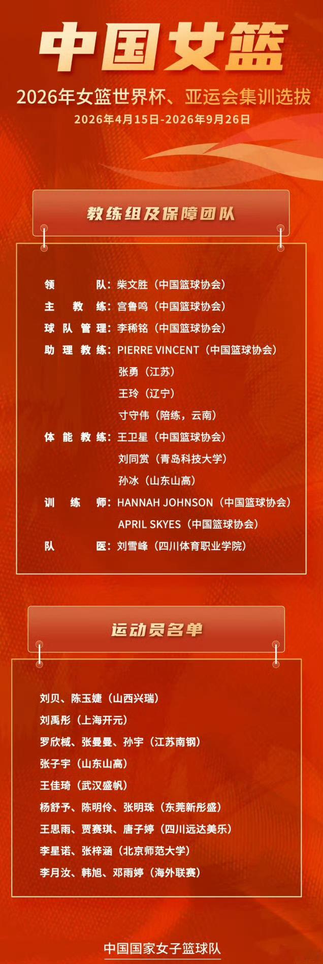 中国女篮公布世界杯亚运会集训名单19人集结,剑指双赛!杨舒予、韩旭、李月汝等名将领衔,大学生球员+海外联赛选手组成多元化阵容,新老交替中暗藏战力跃升✨4月15日起北京集训启动,国内热身赛后将赴澳欧拉练,9月接连征战柏林世界杯与名古屋亚运会,赛程紧凑更显冲冠决心!主教练宫鲁鸣聚焦攻防转换、关键球处理等核心短板,动态调整阵容全力备战。每一次集训都是蜕变的开始,为中国女篮的全力以赴加油,期待她们在国际赛场再创佳绩🇨🇳