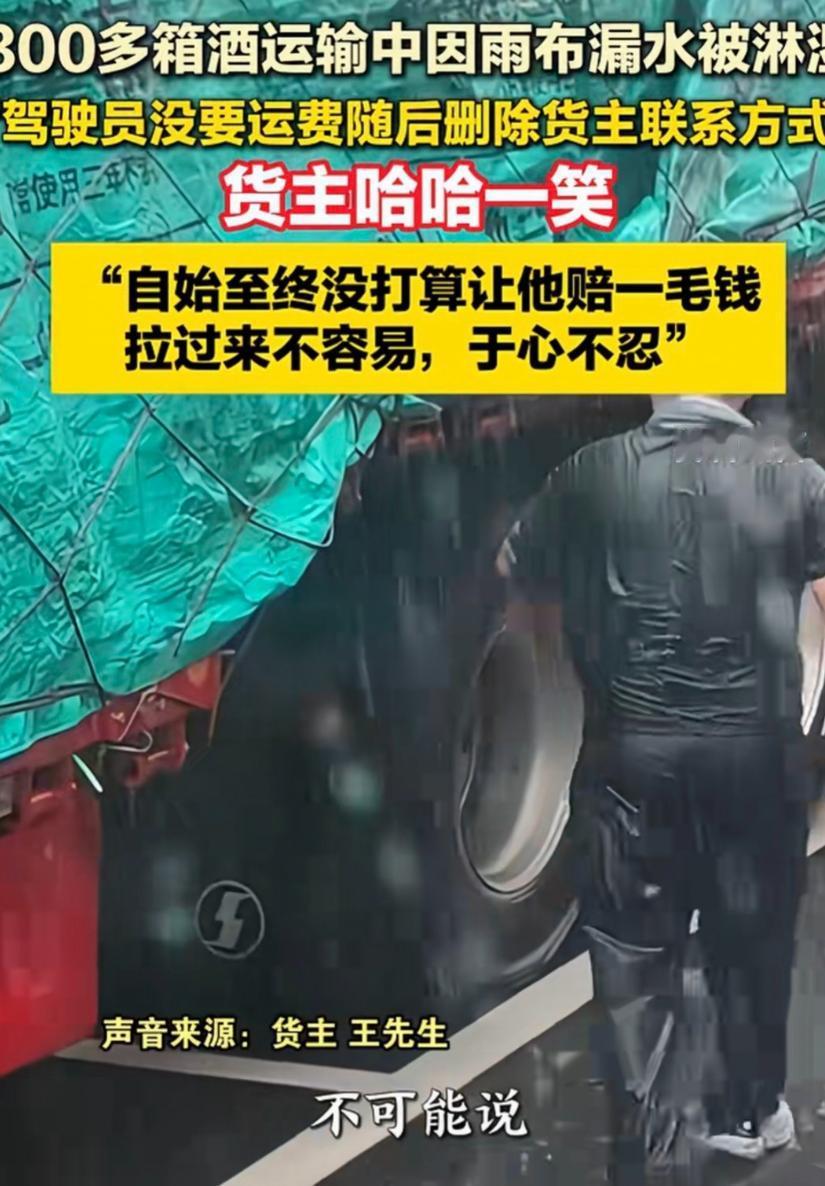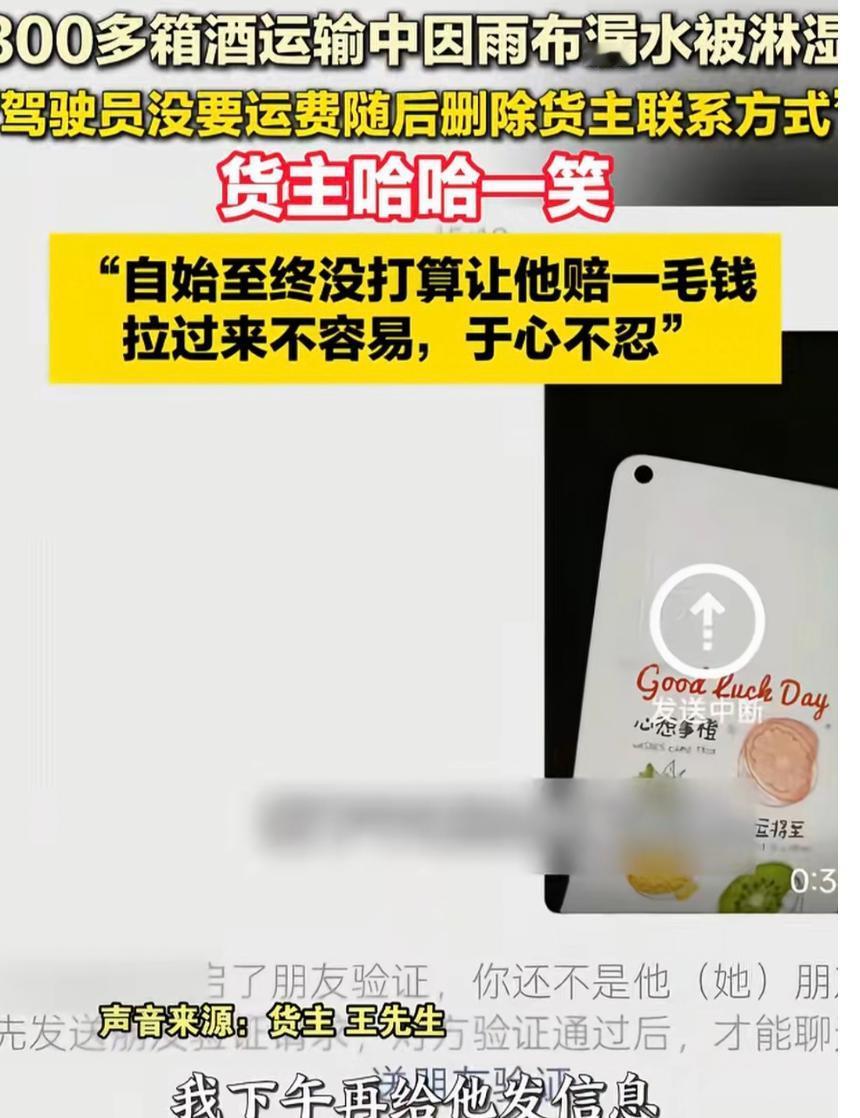 “老板大气!”安徽,男子找一货车司机运送345箱酒,送到后,他掀开雨布发现最少有300箱酒被淋湿,司机说:340元运费我不要了,你看咋弄吧。然后,开车走了。等男子给司机发信息协商时,不料,对方竟然把拉黑,微信也删除了。男子无奈,哈哈一笑说:我从来没打算让他赔一毛钱。之后,说了一番话令人感动。网友:司机格局小了。