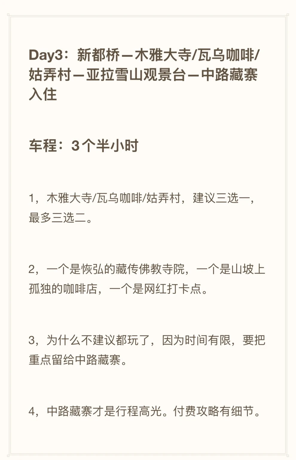 加大榆磨路和中路藏寨的占比,也可以让整个行程的景色更有差异化,再点缀一些温泉,网红咖啡,寺院投喂野生动物,轻徒步,全程体验就非常丰富了